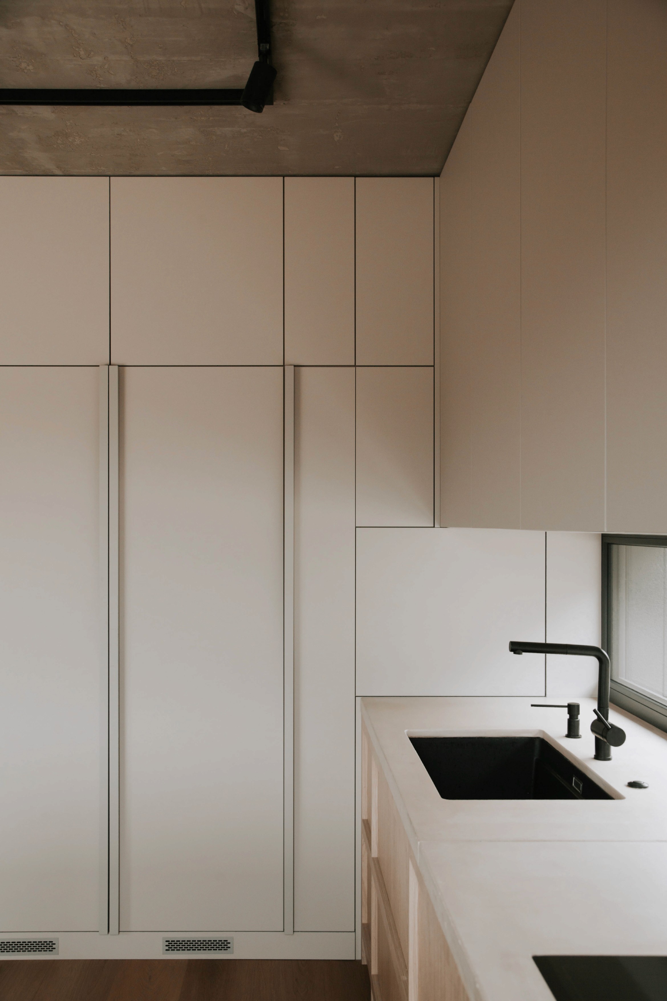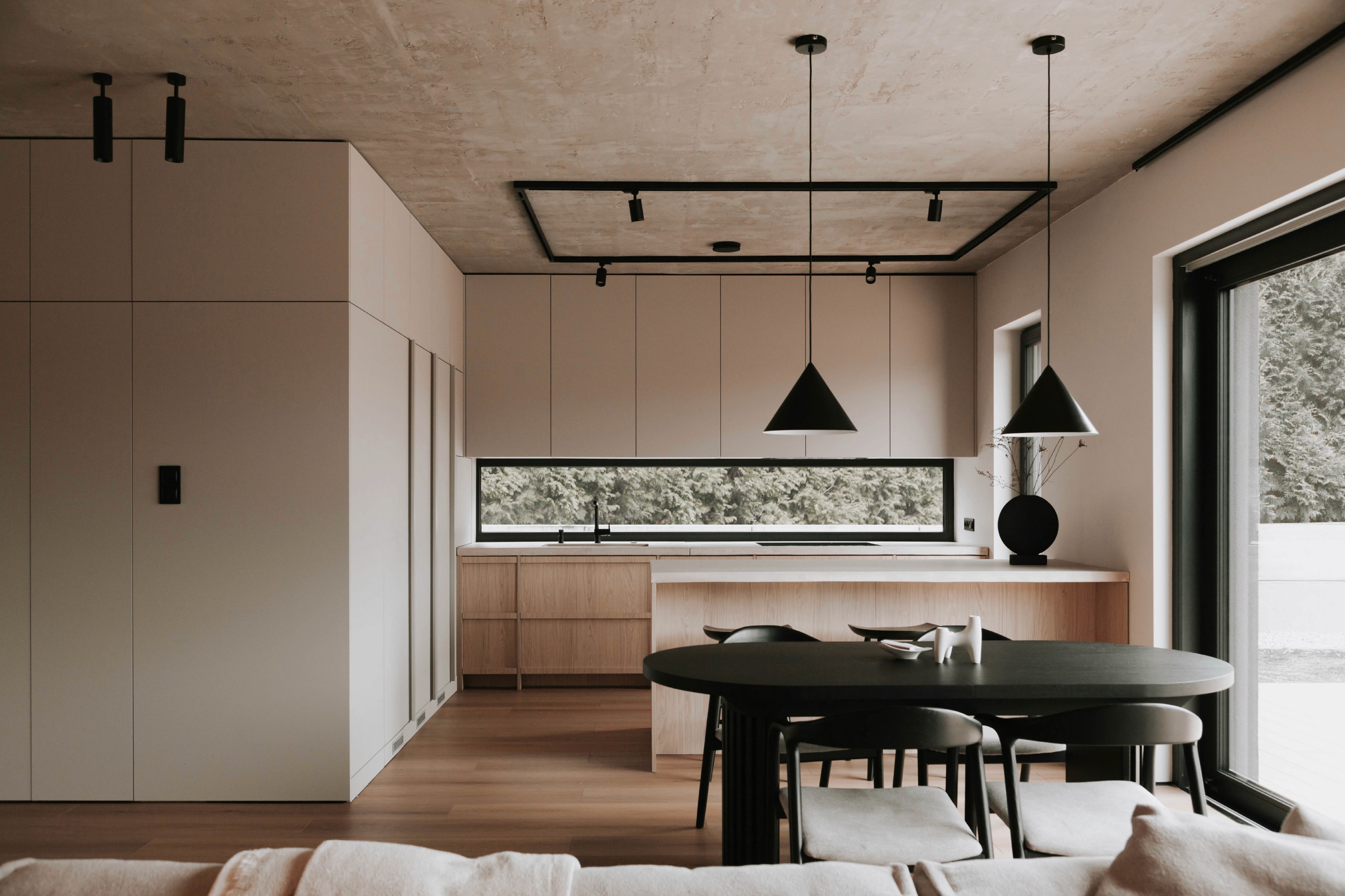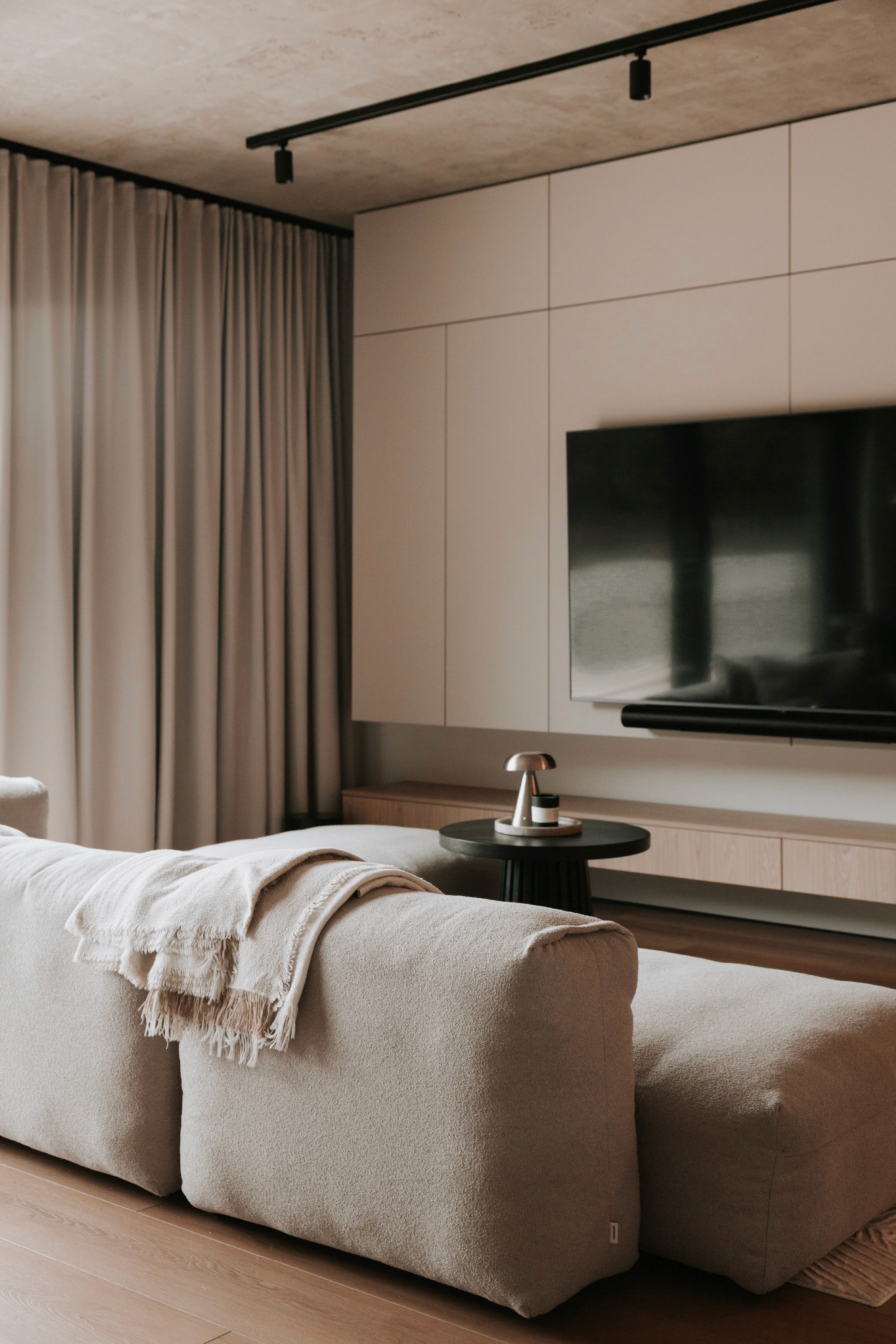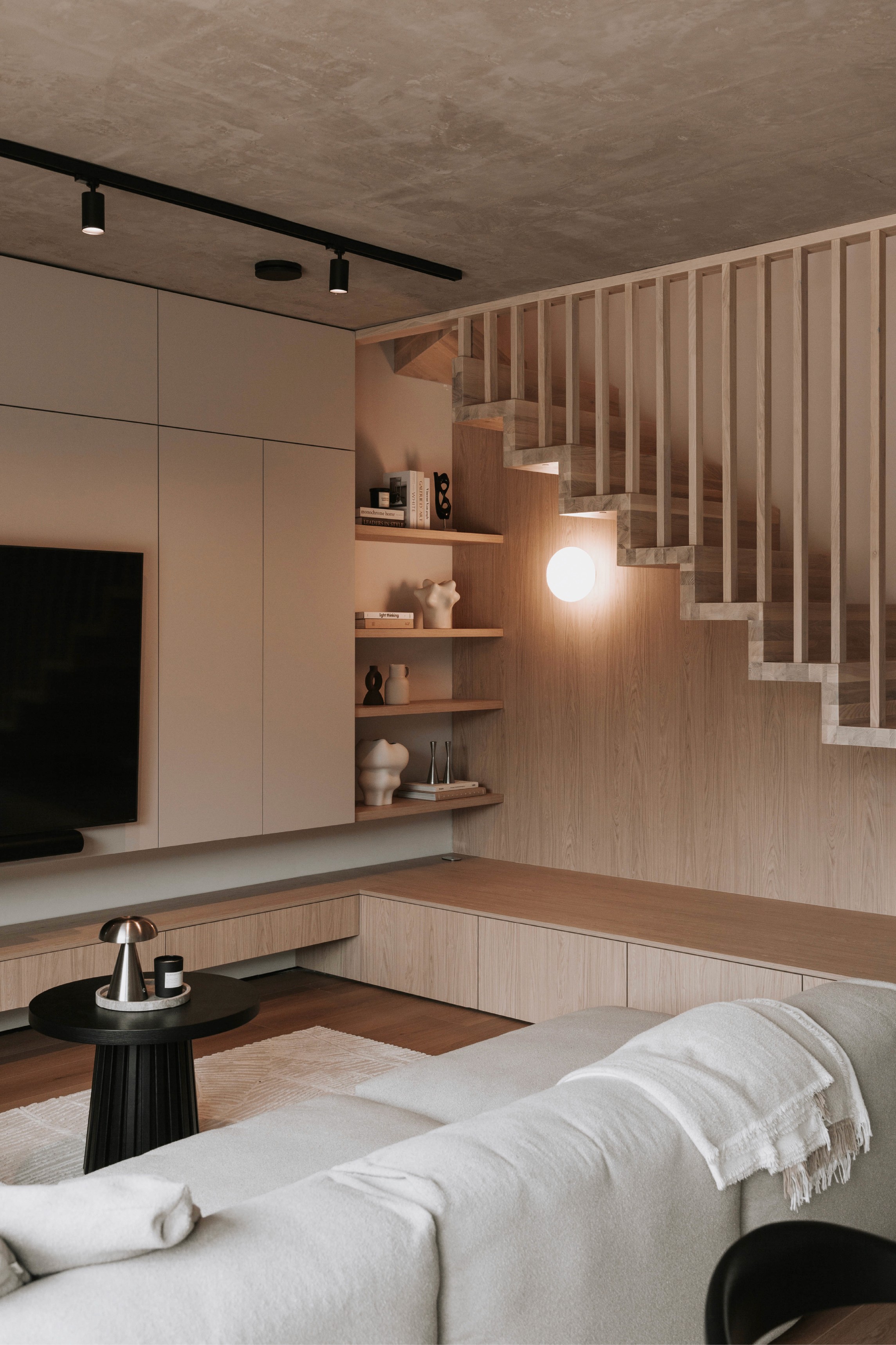 Surowa struktura betonu spotyka się tu z ciepłem naturalnego drewna, tworząc wnętrze, w którym minimalizm harmonijnie łączy się z funkcjonalnością. Stonowana paleta beżów i szarości przewija się przez wszystkie pomieszczenia, stanowiąc spokojne tło codziennego życia.