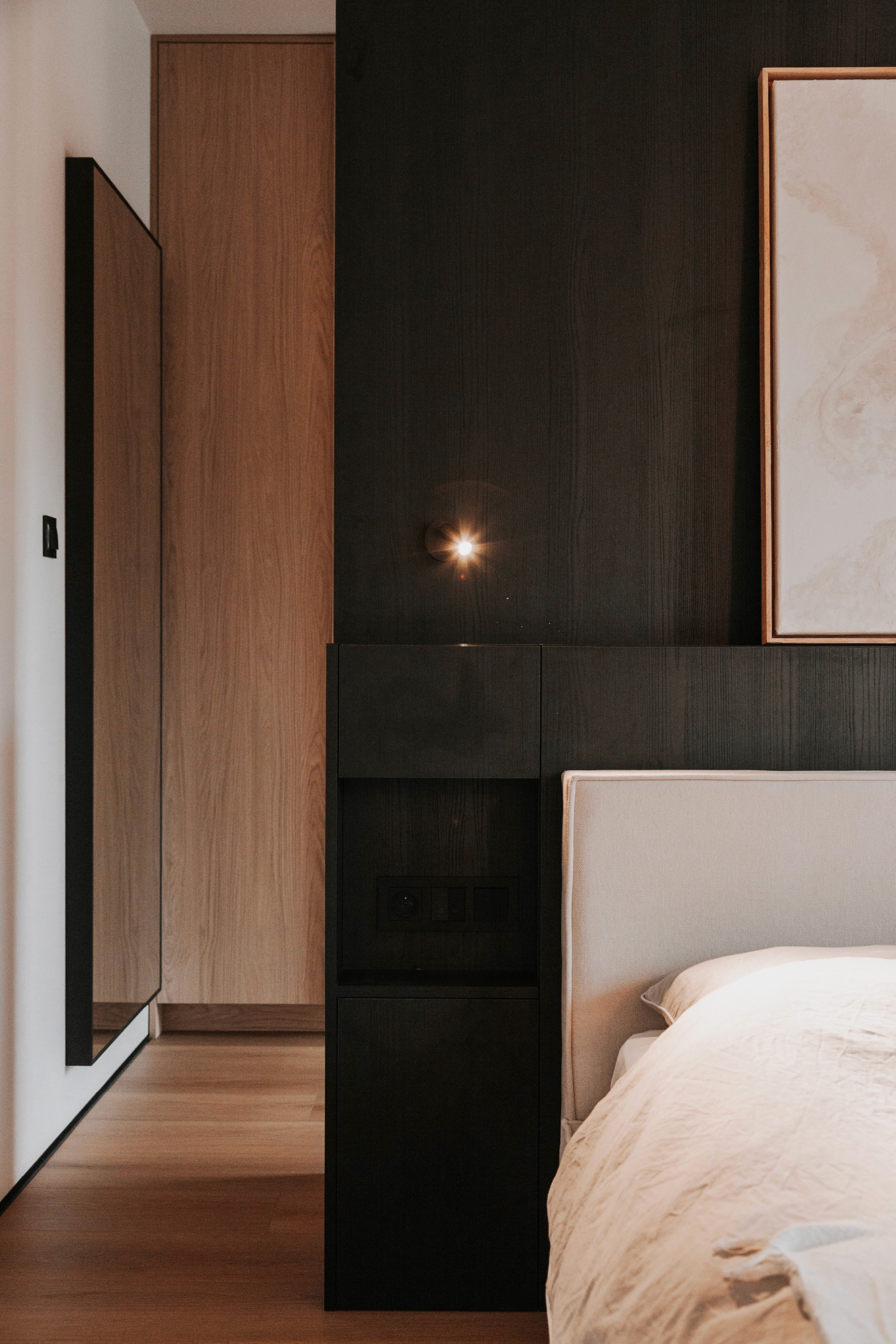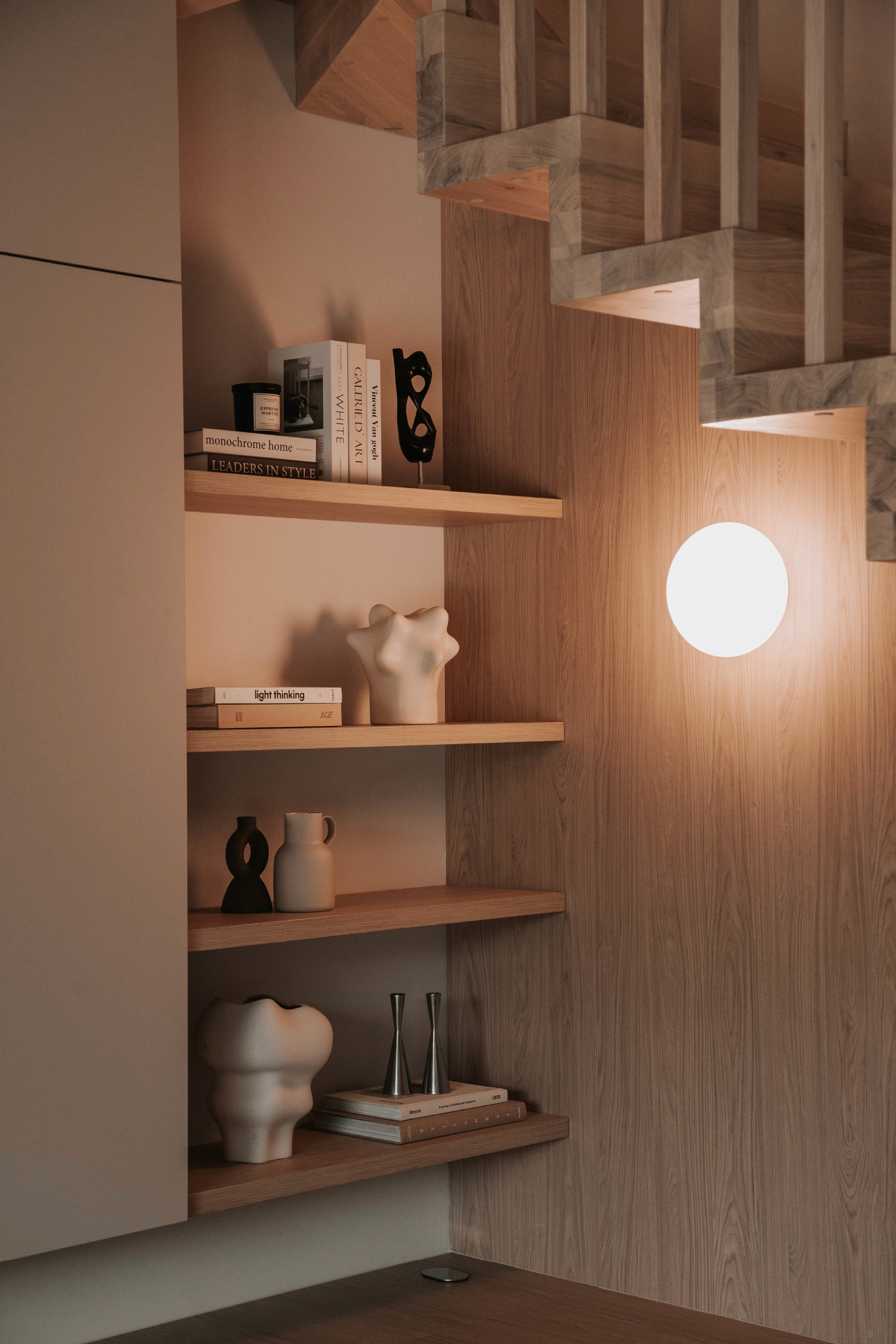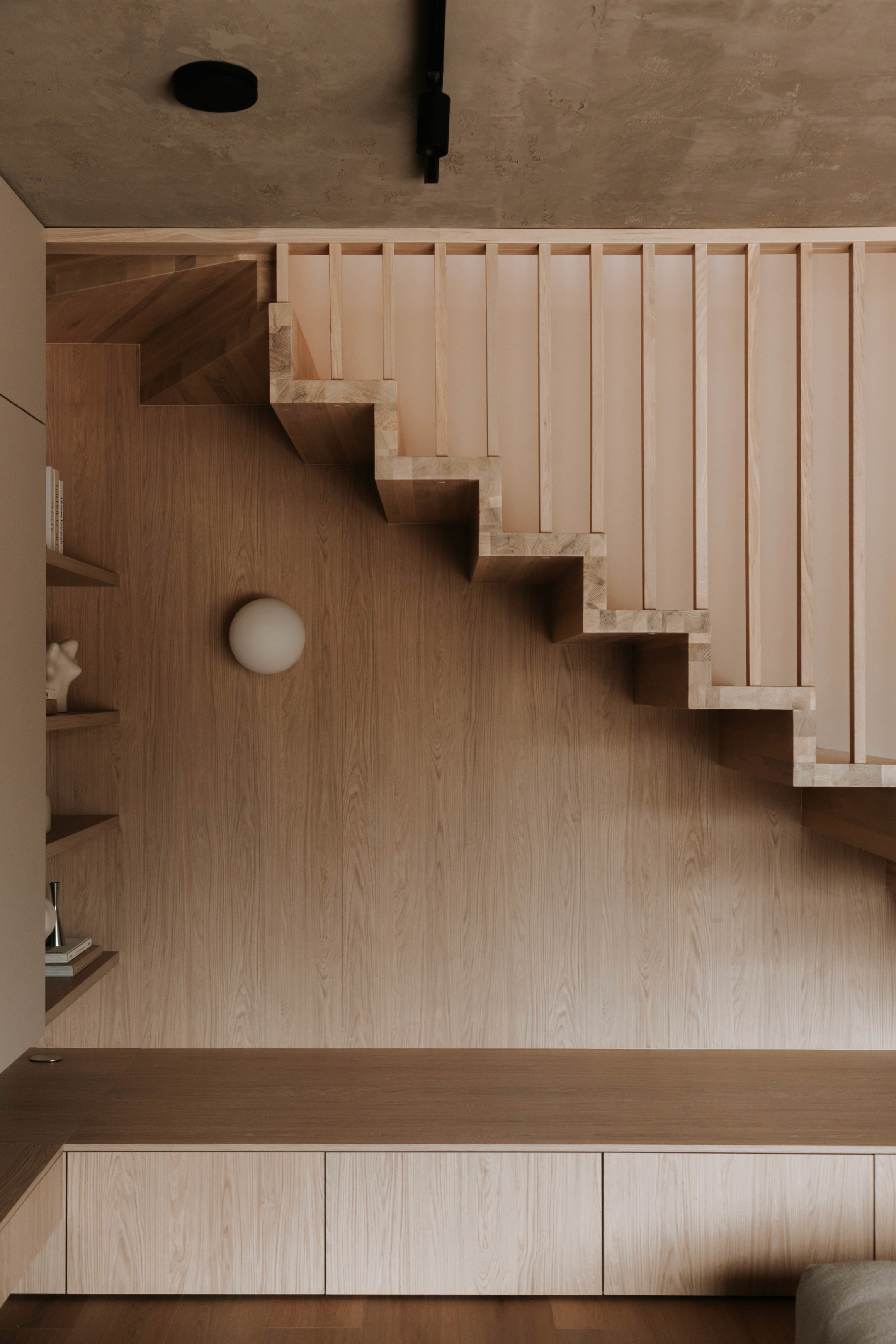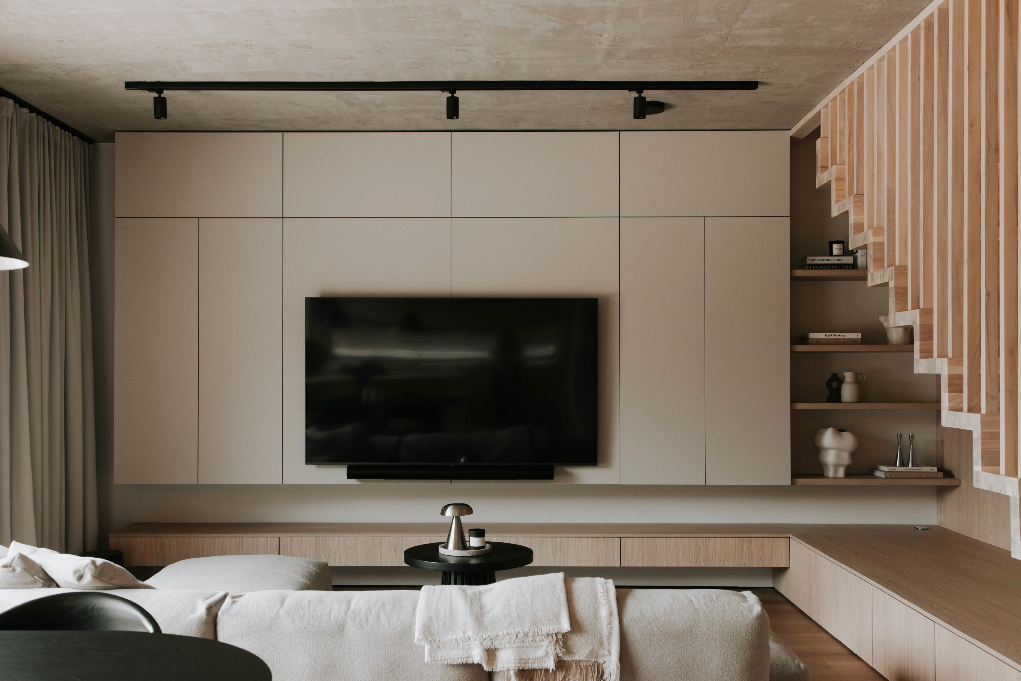 Surowa struktura betonu spotyka się tu z ciepłem naturalnego drewna, tworząc wnętrze, w którym minimalizm harmonijnie łączy się z funkcjonalnością. Stonowana paleta beżów i szarości przewija się przez wszystkie pomieszczenia, stanowiąc spokojne tło codziennego życia.