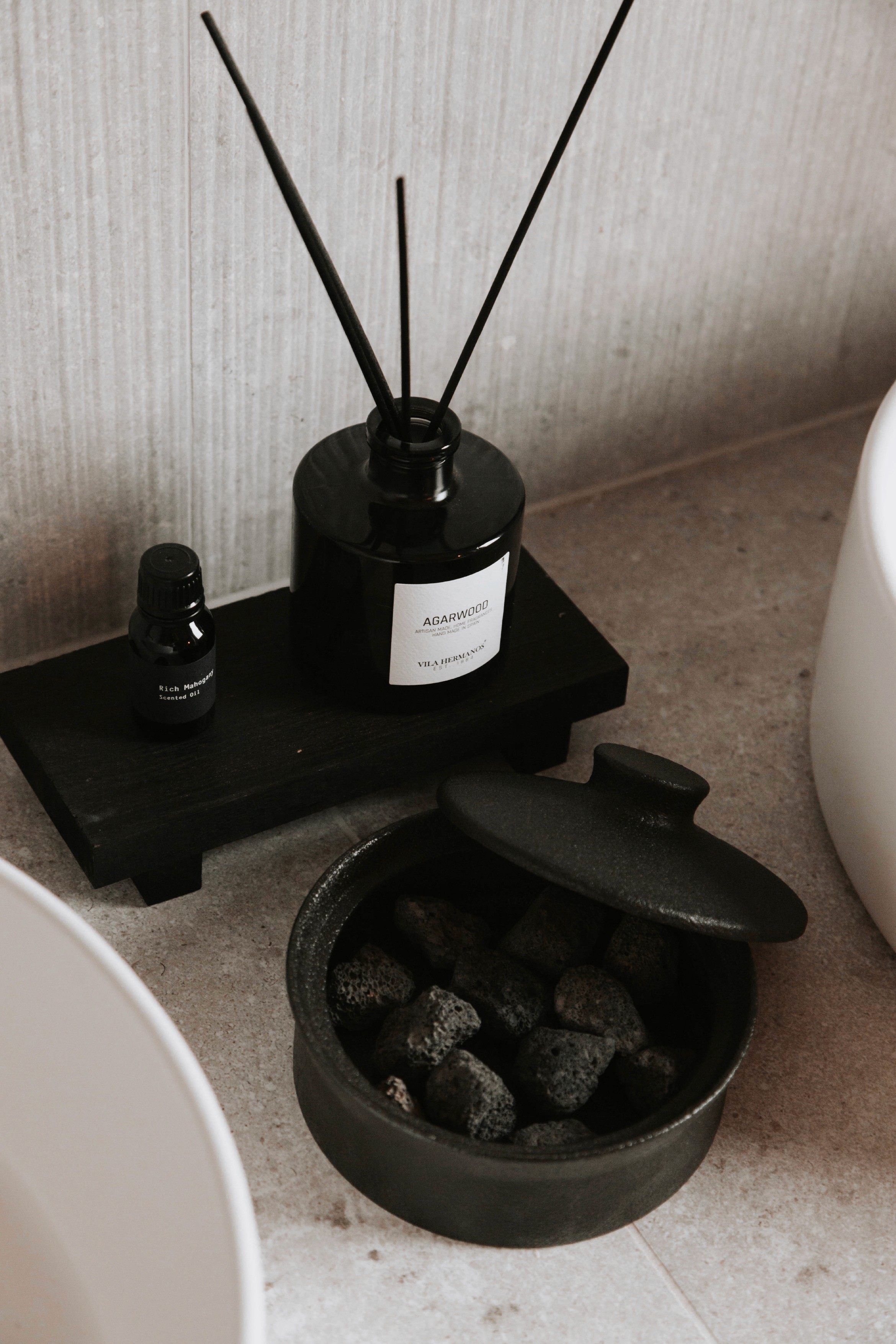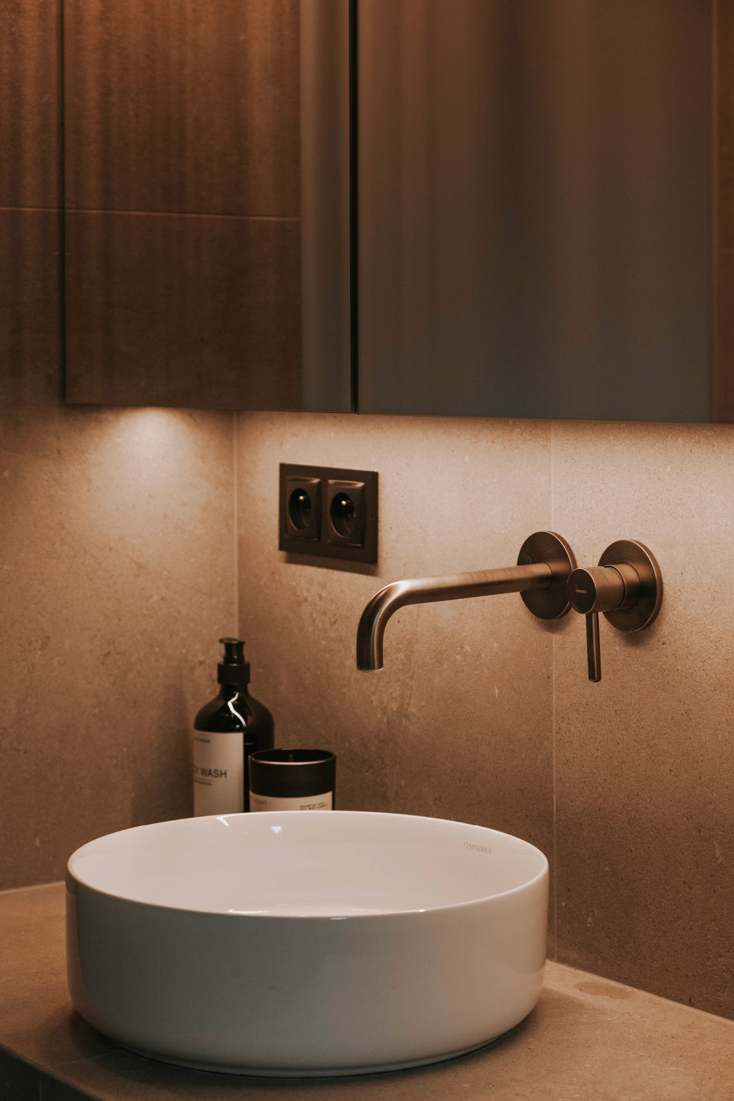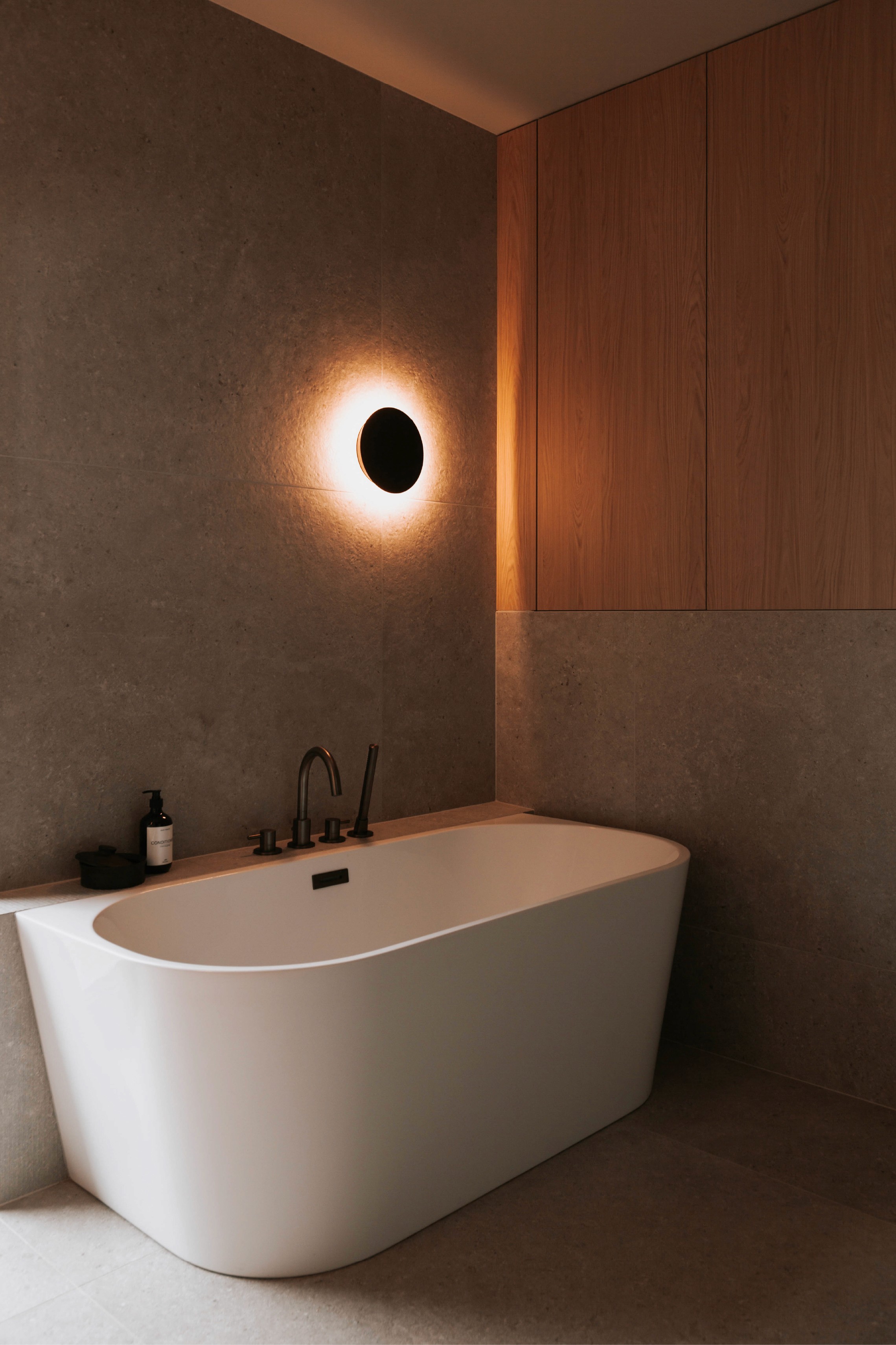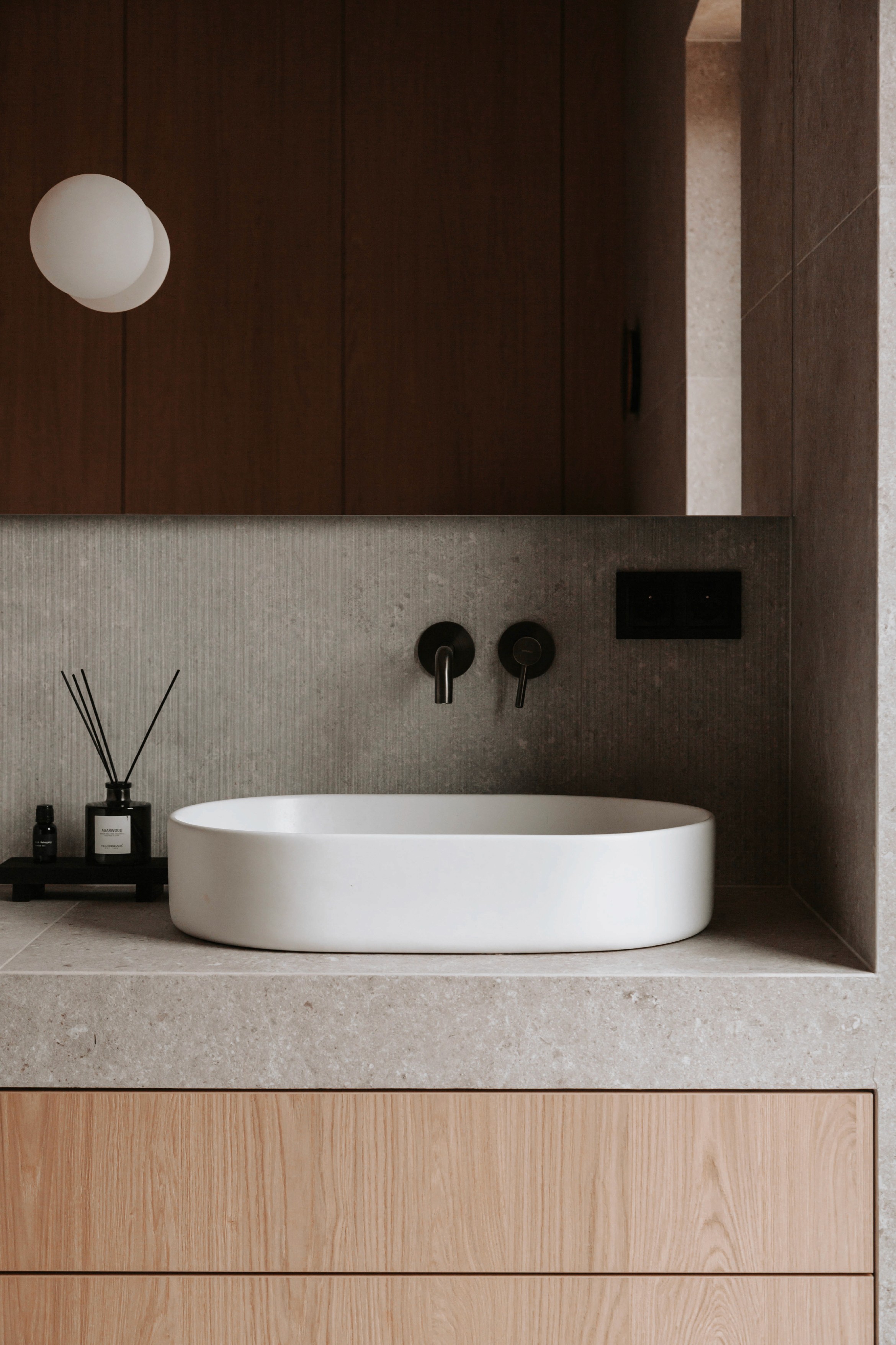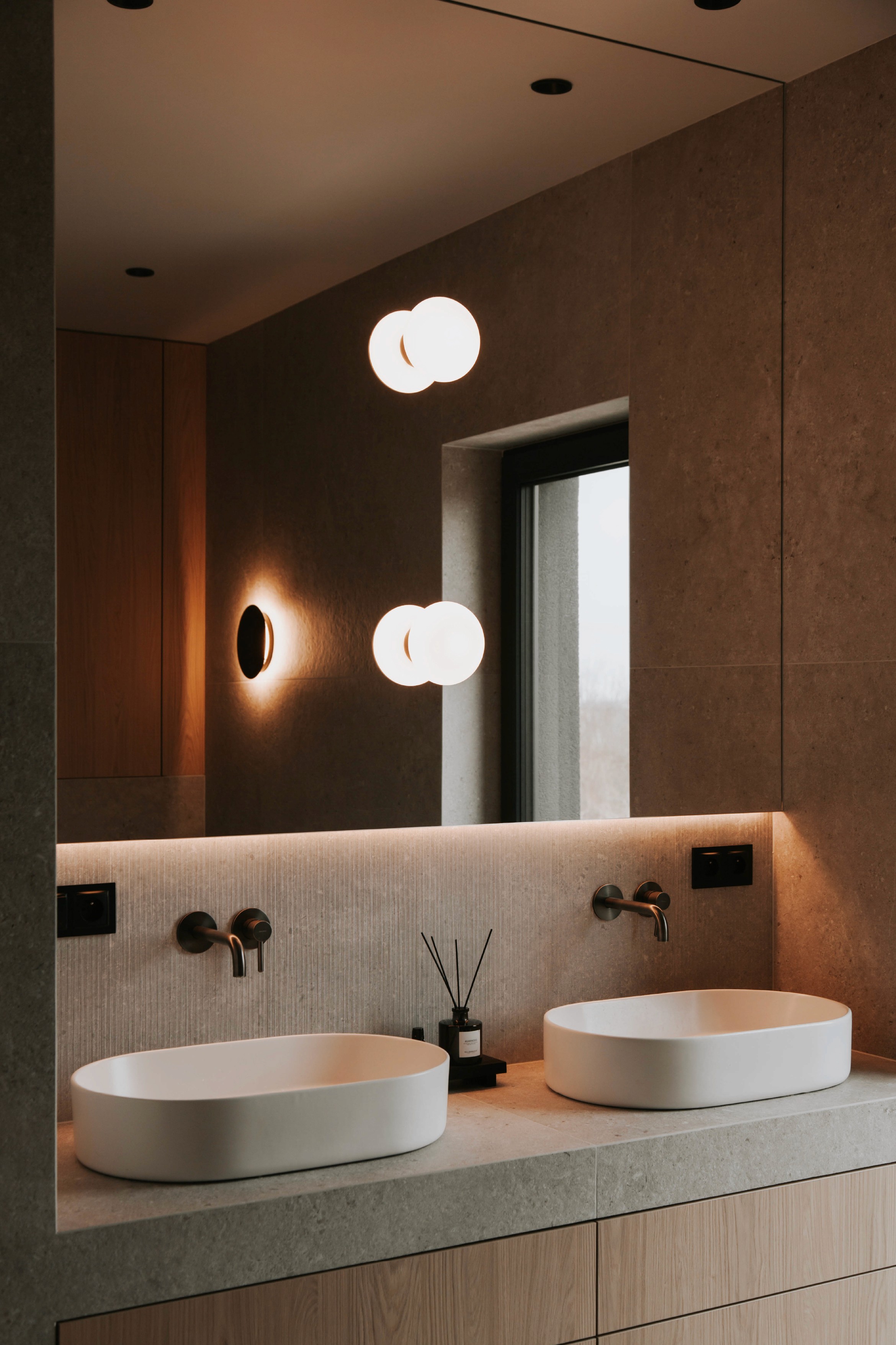 Płytki o fakturze naturalnego kamienia łączą się tu z ciepłem drewnianych elementów, tworząc przestrzeń pełną równowagi i spokoju. Naturalne materiały w odcieniach szarości i beżu stanowią idealne tło dla minimalistycznej ceramiki i czarnych akcentów. Całość dopełnia subtelne, ciepłe oświetlenie oraz okrągłe kinkiety, które wprowadzają miękki kontrast wobec geometrycznych form.