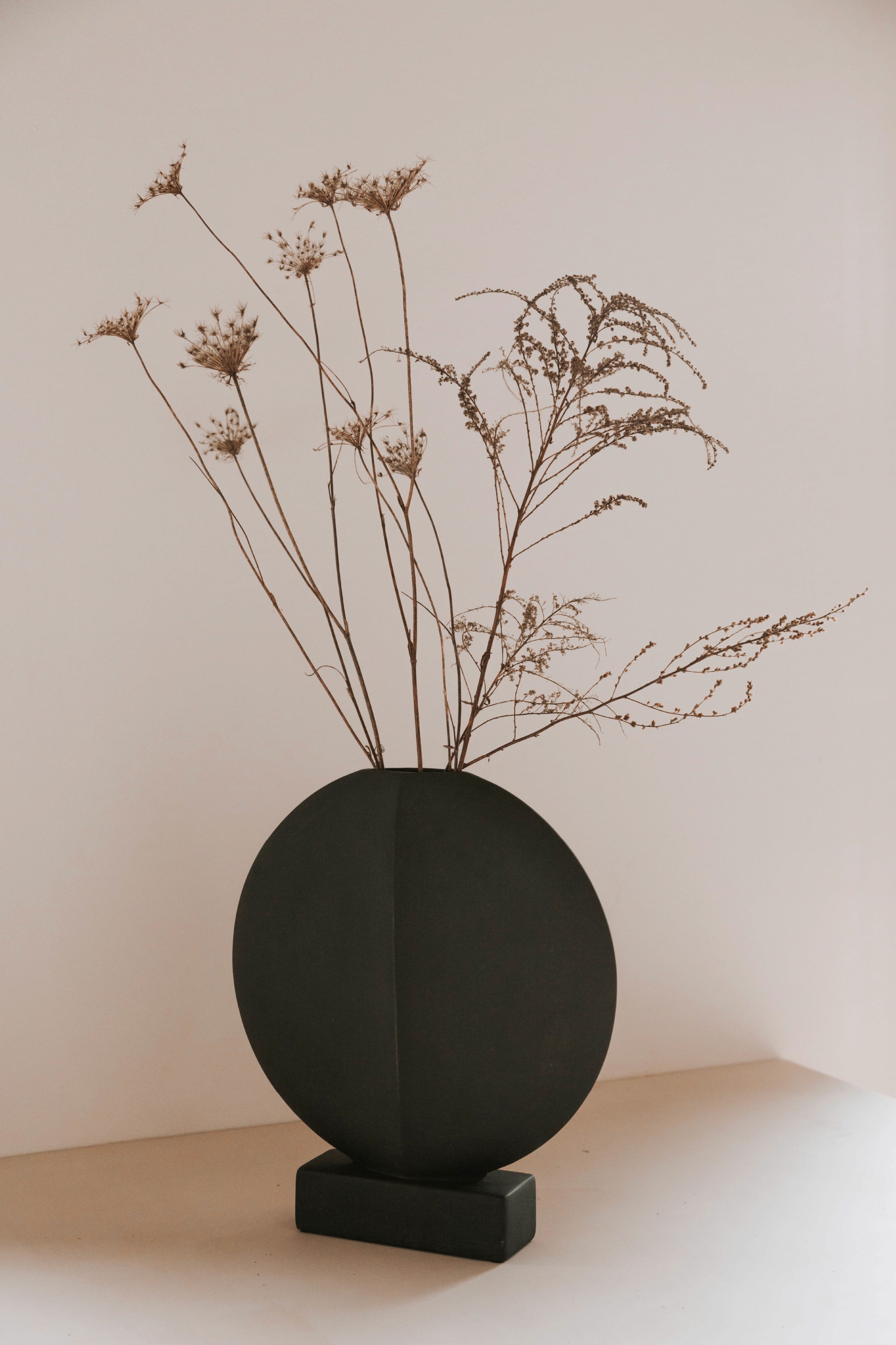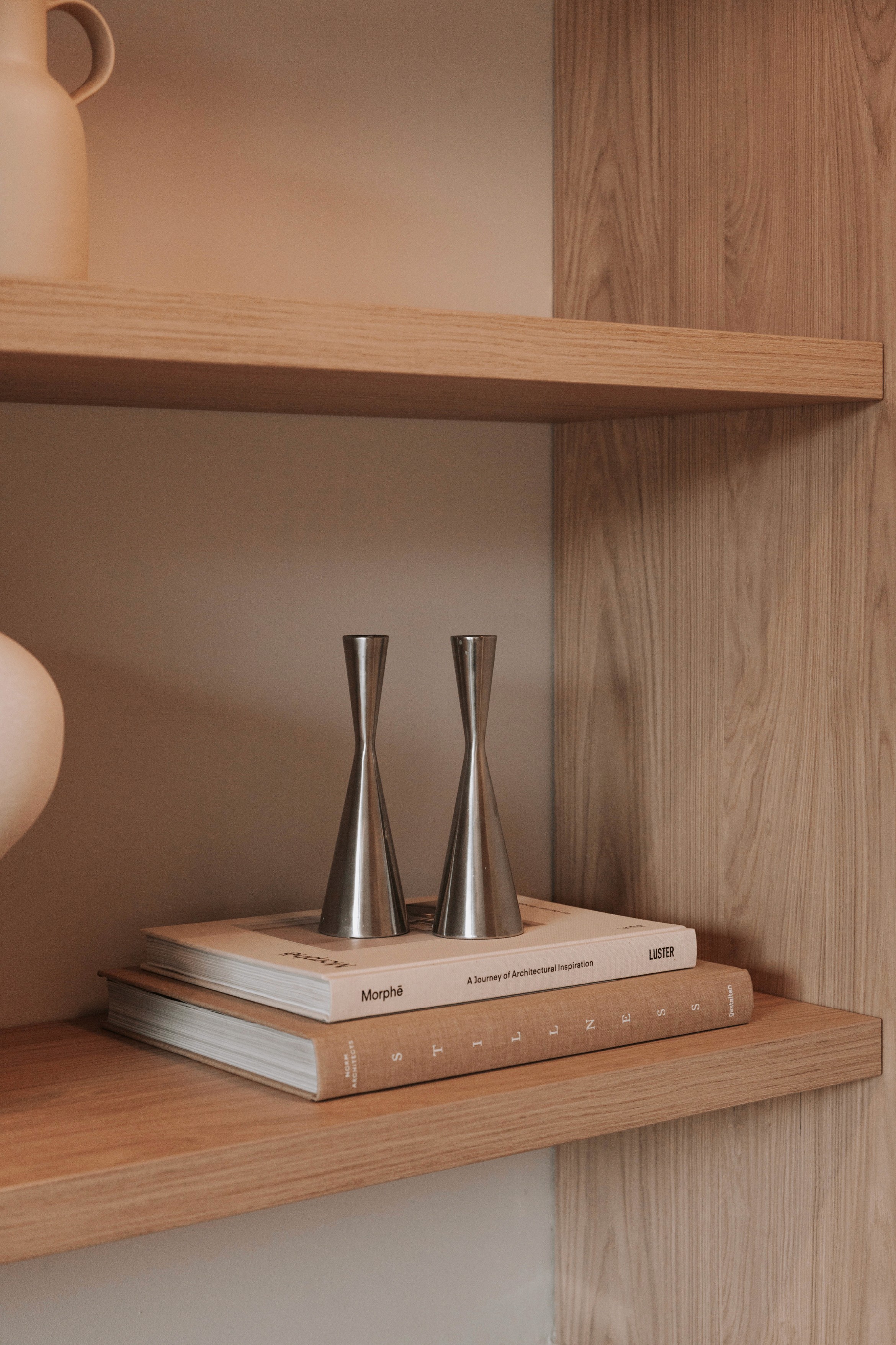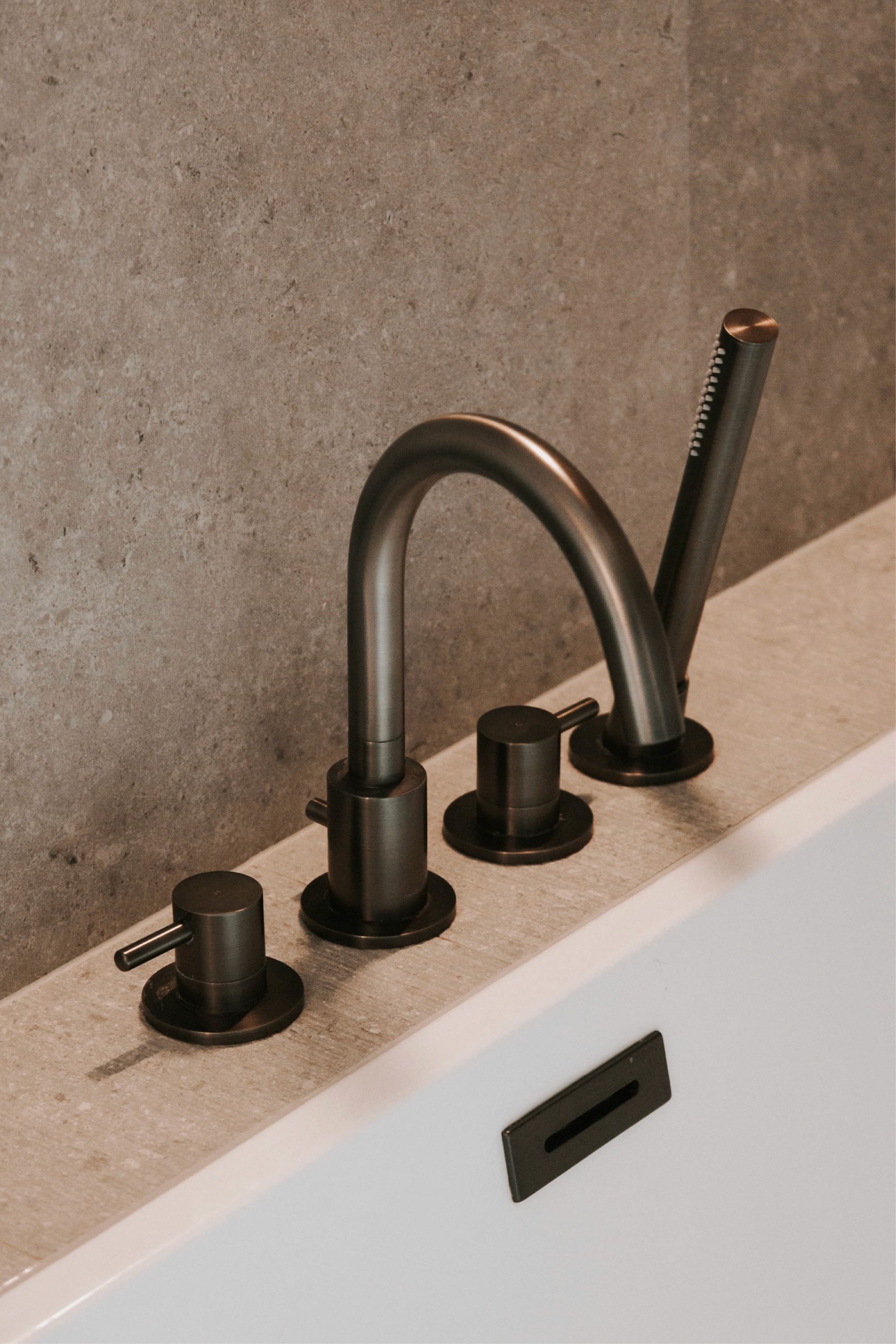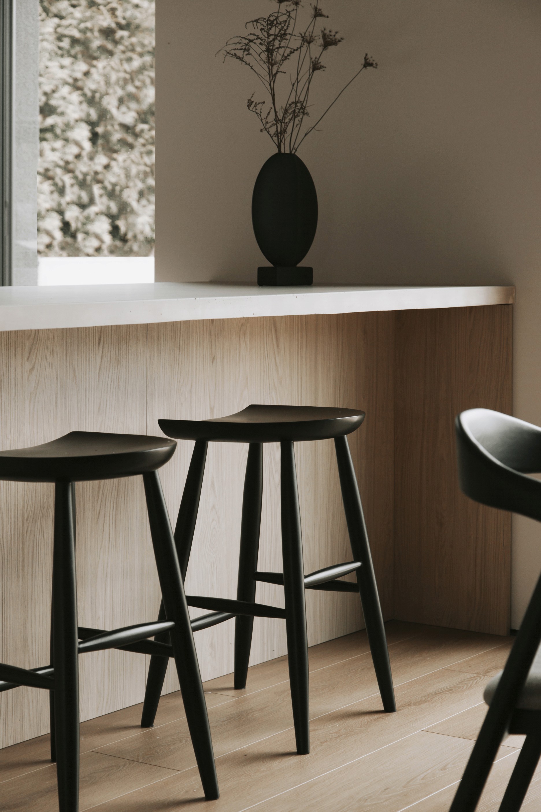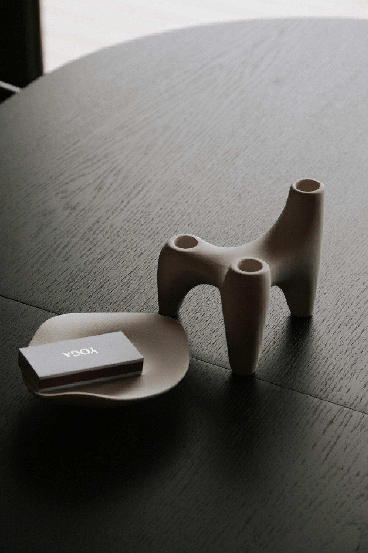 Płytki o fakturze naturalnego kamienia łączą się tu z ciepłem drewnianych elementów, tworząc przestrzeń pełną równowagi i spokoju. Naturalne materiały w odcieniach szarości i beżu stanowią idealne tło dla minimalistycznej ceramiki i czarnych akcentów. Całość dopełnia subtelne, ciepłe oświetlenie oraz okrągłe kinkiety, które wprowadzają miękki kontrast wobec geometrycznych form.