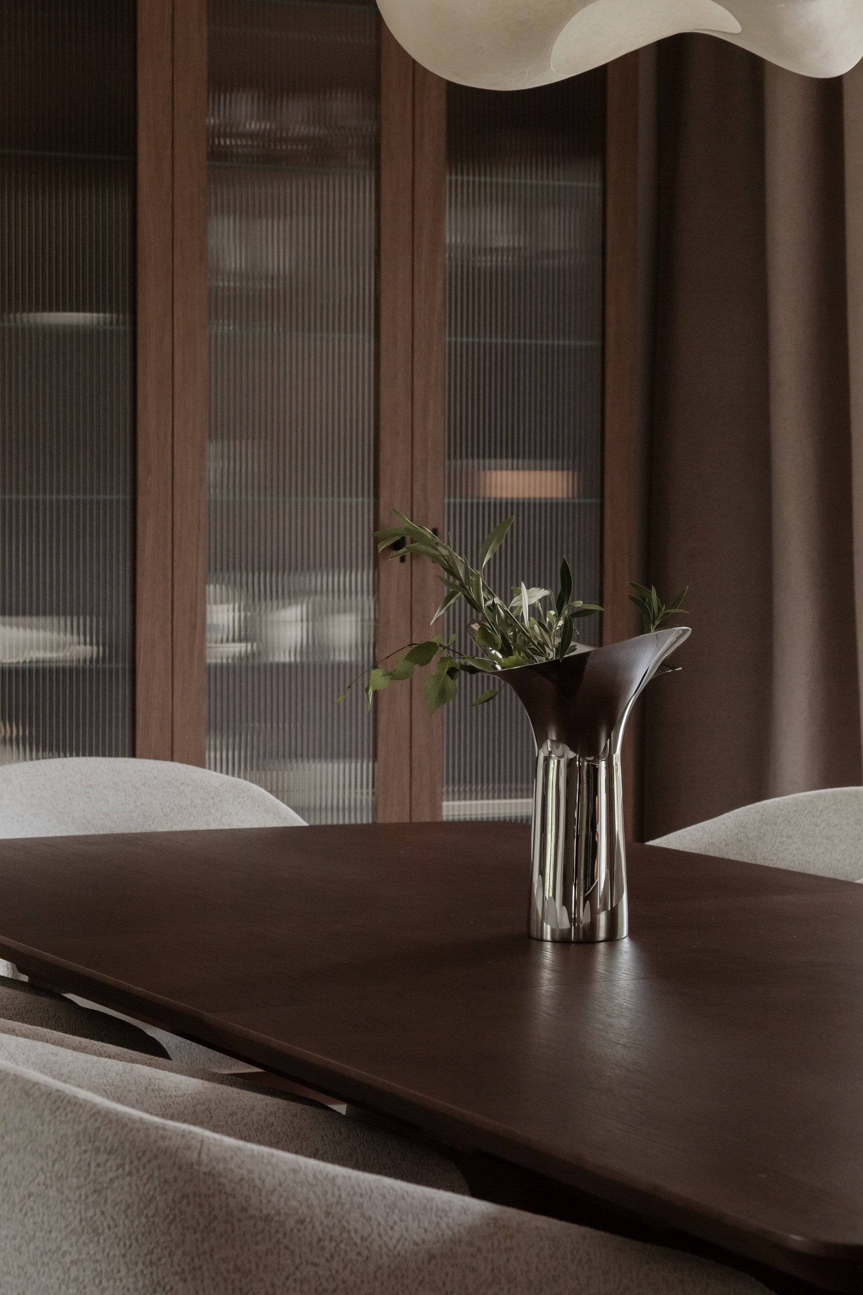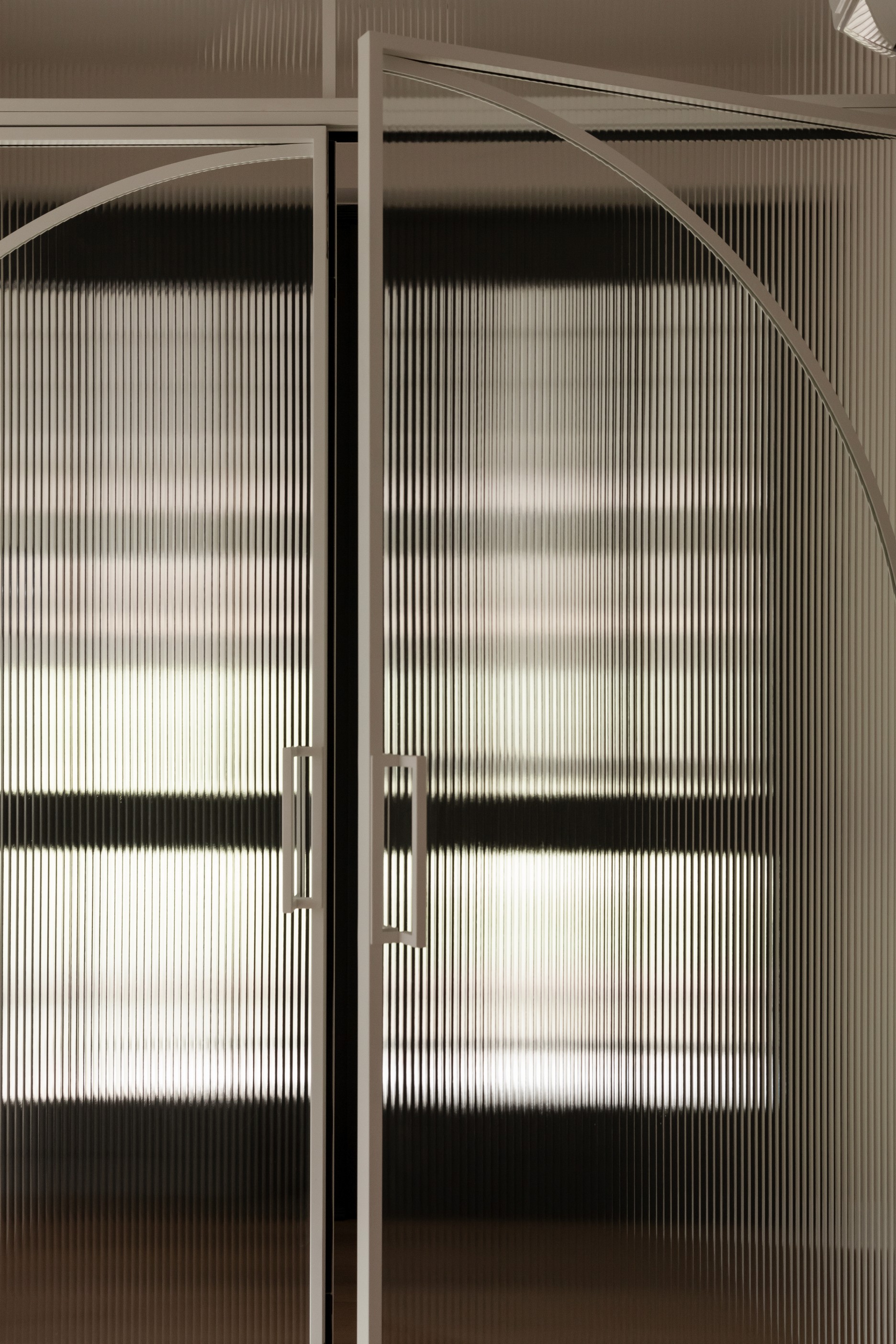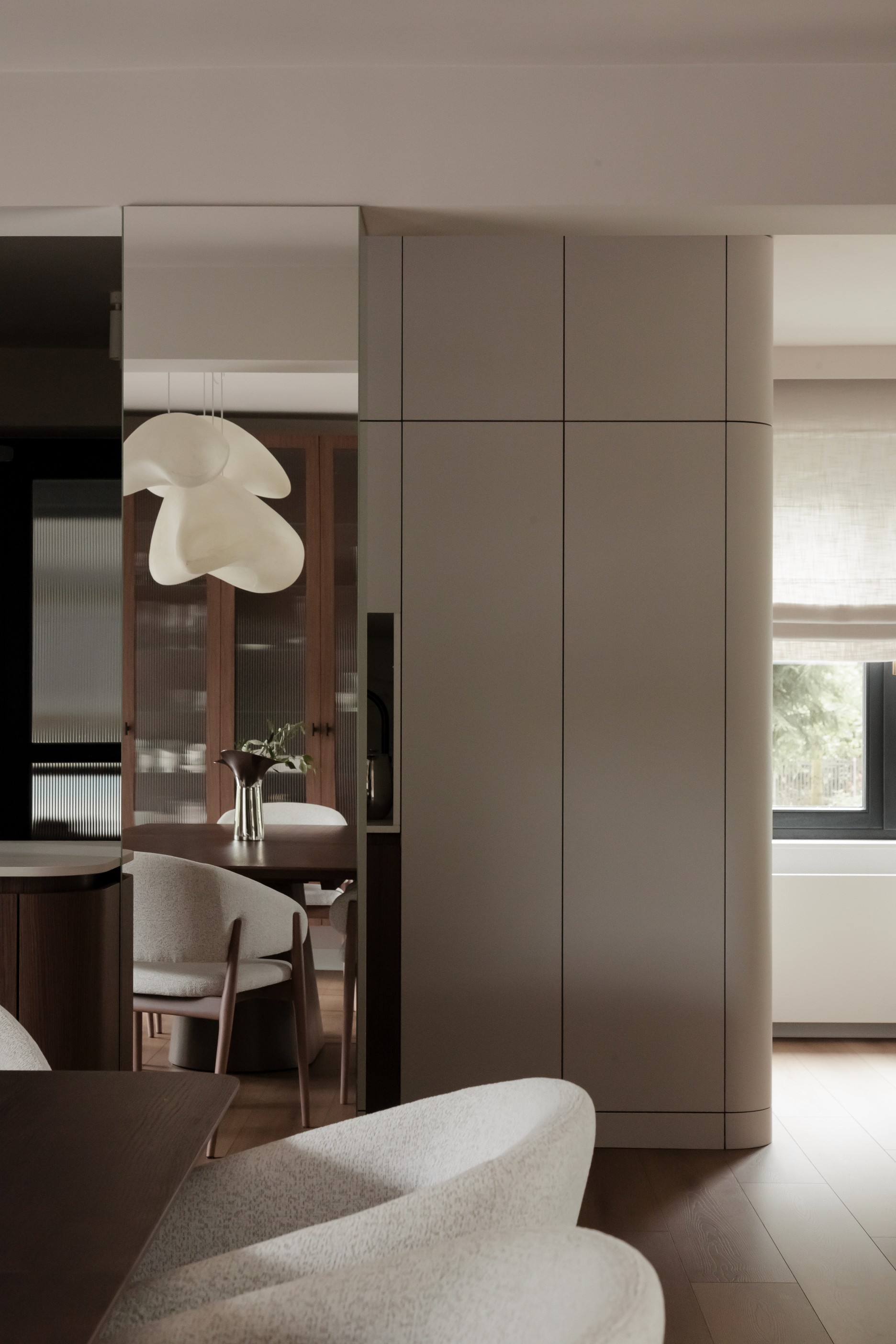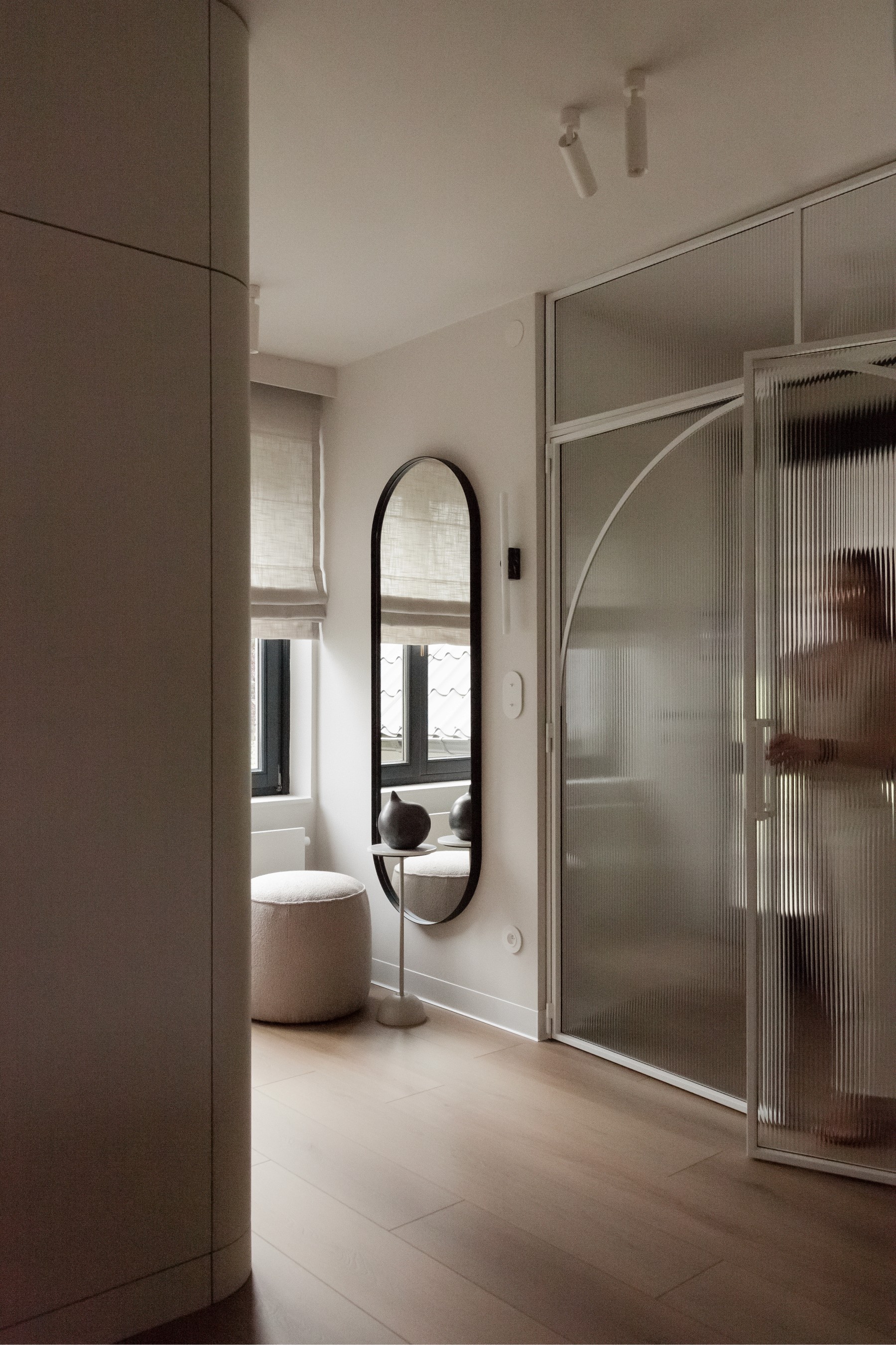 Kluczową rolę odegrały miękkie, zaoblone linie, które złagodziły odbiór wnętrza i wprowadziły płynność komunikacji. Zastosowane rozwiązania nadały przestrzeni lekkości i wizualnej harmonii, a jednocześnie podkreśliły jej elegancki charakter. Przeszklone drzwi z zaoblonymi szprosami otworzyły część dzienną na więcej światła, a obłożony lustrem słup dodatkowo potęguje wrażenie przestronności.