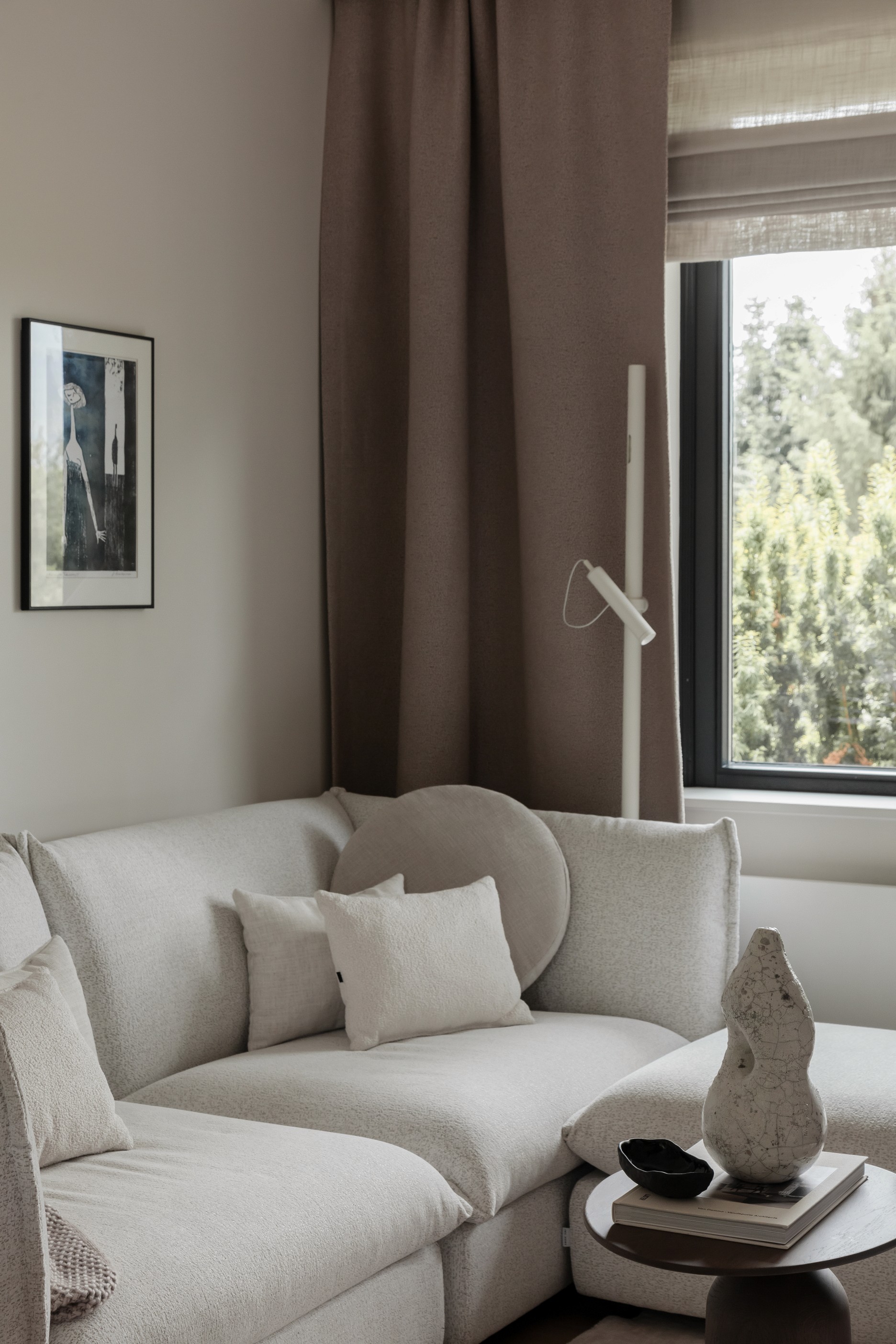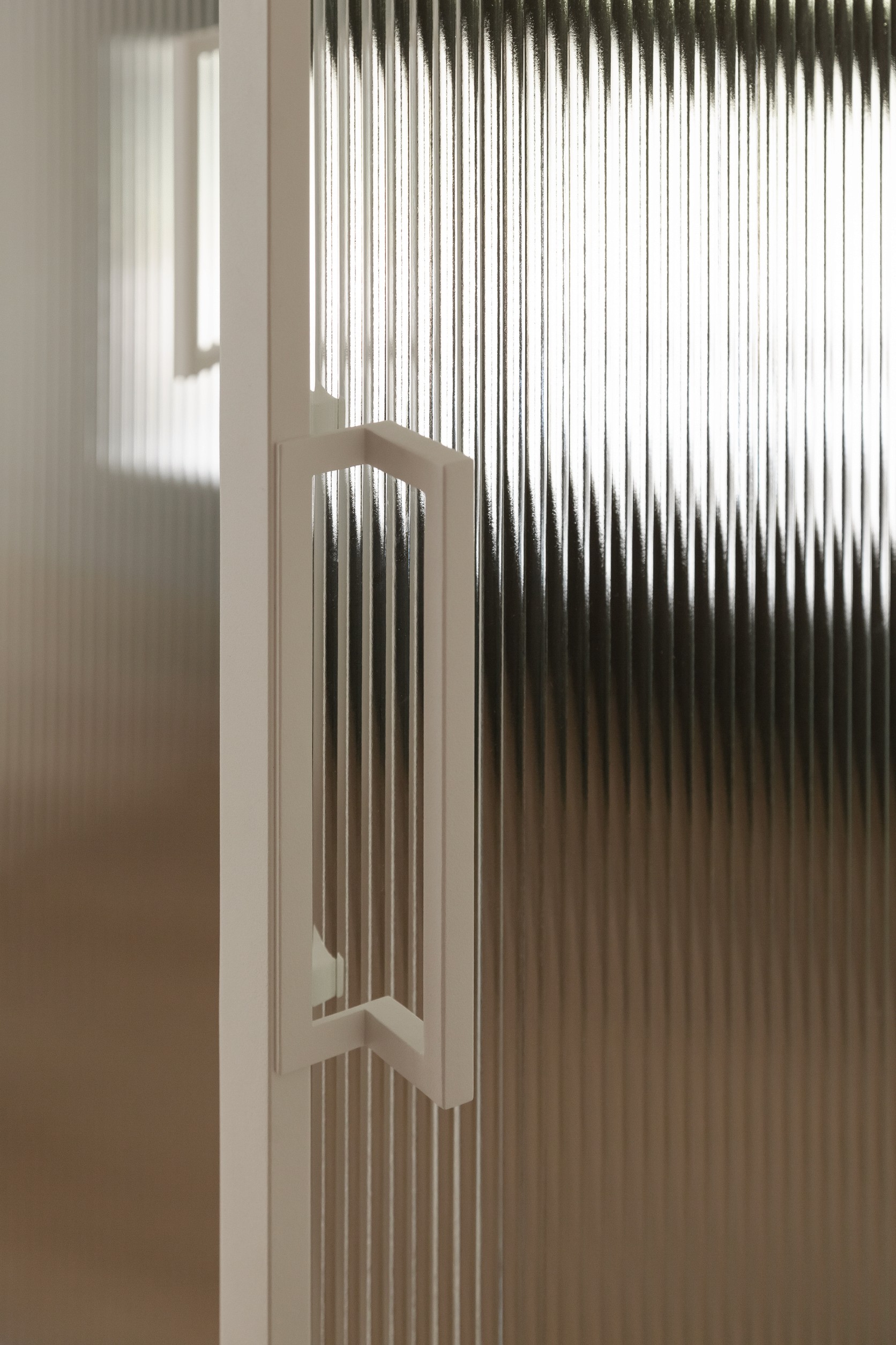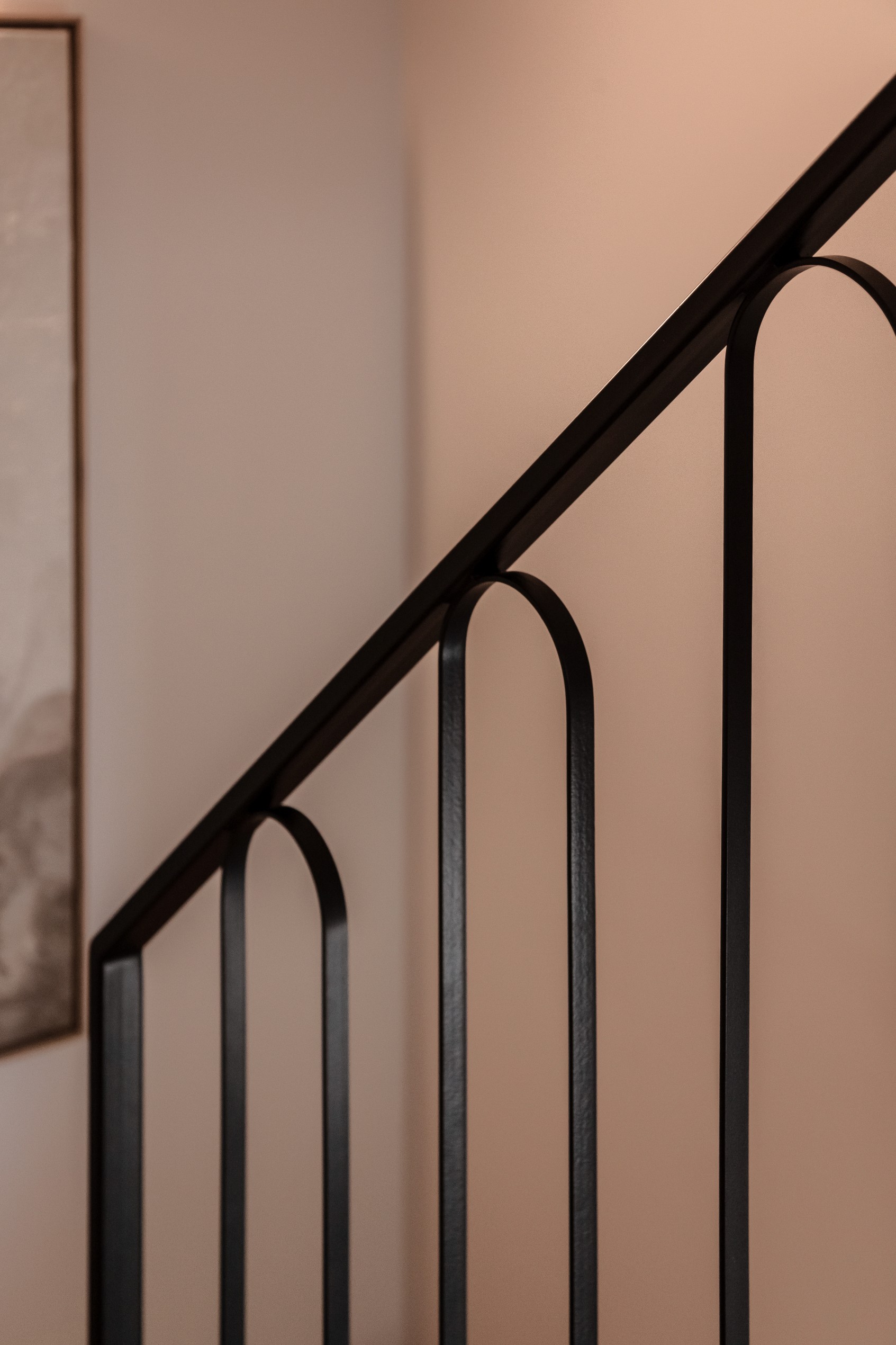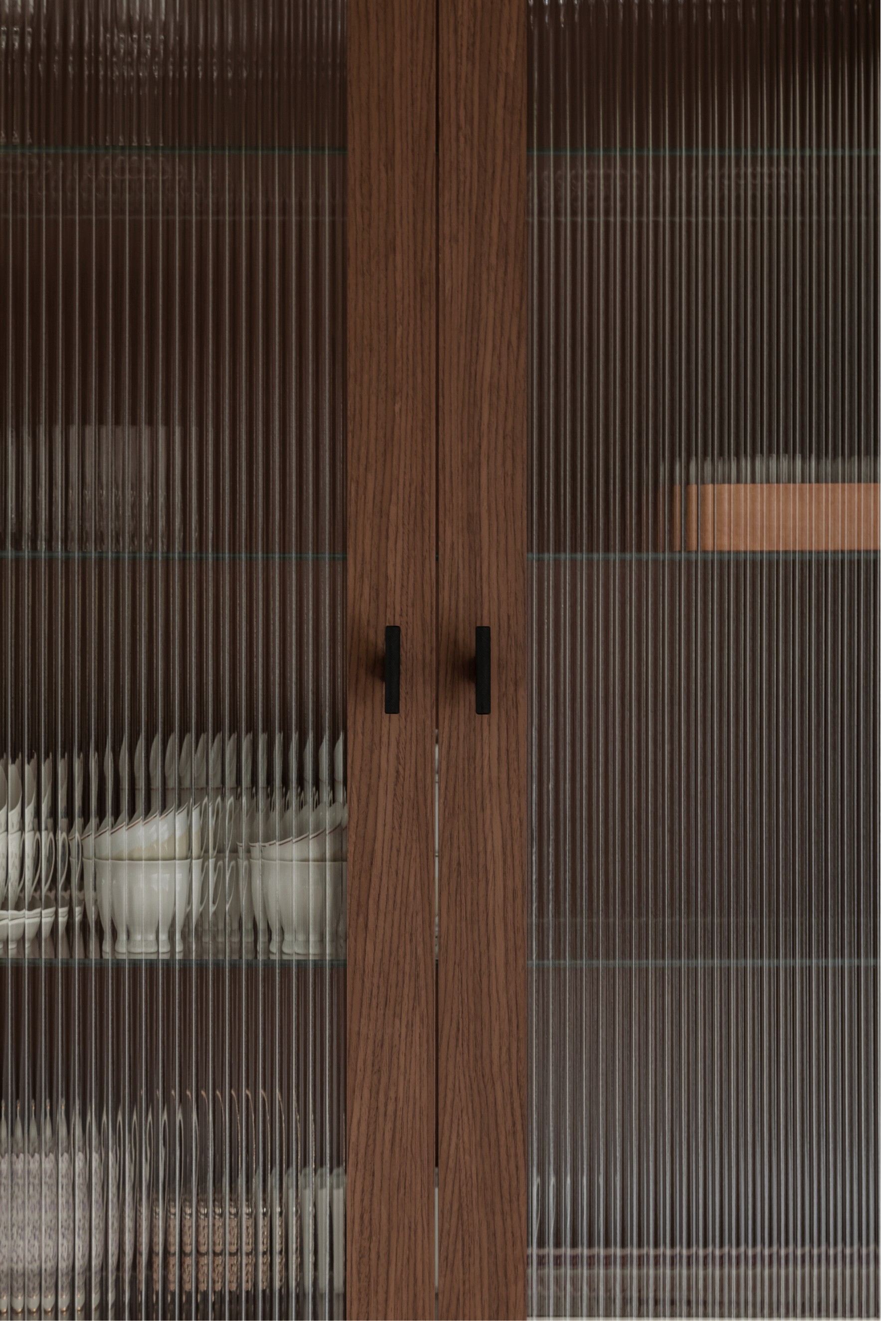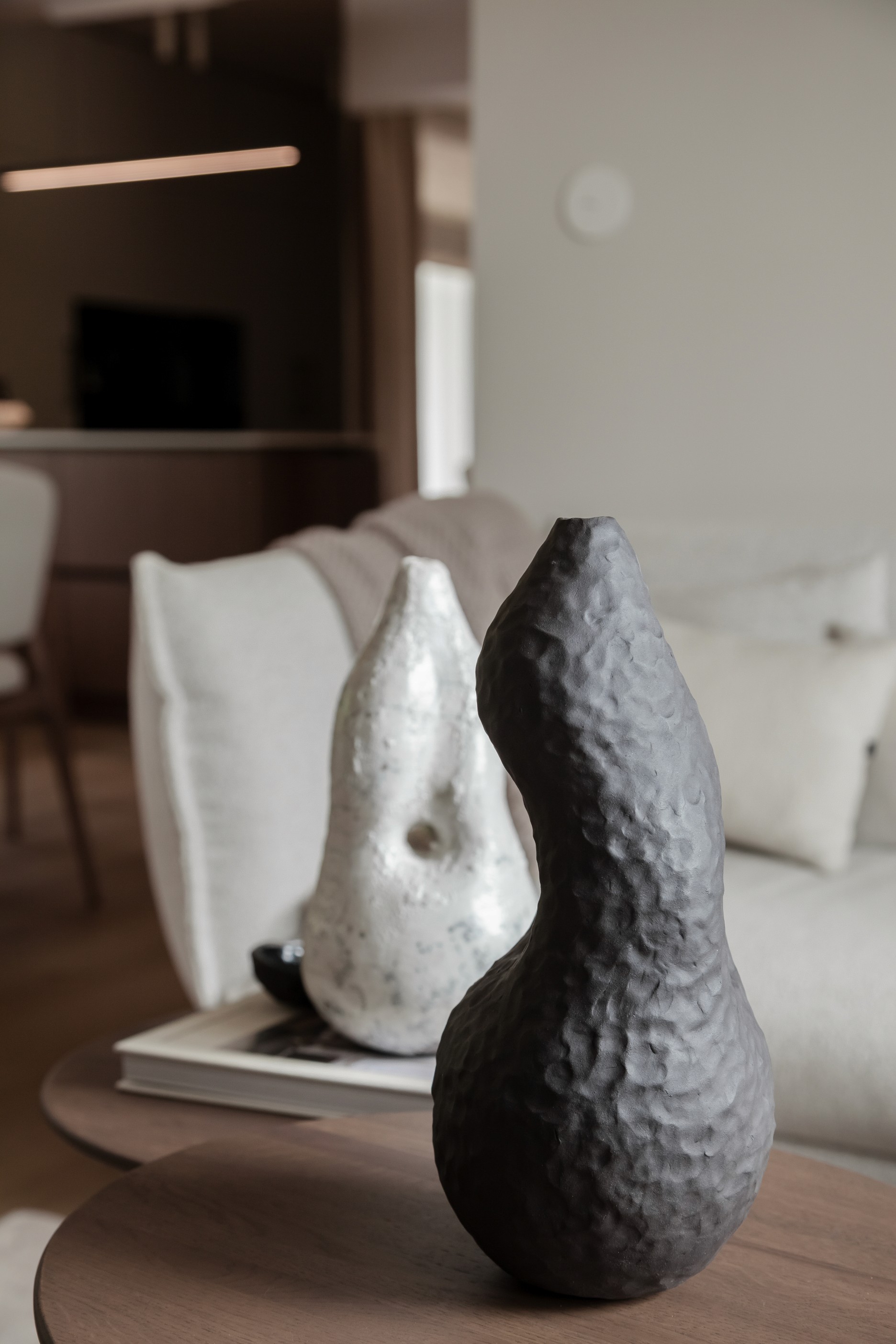 Kluczową rolę odegrały miękkie, zaoblone linie, które złagodziły odbiór wnętrza i wprowadziły płynność komunikacji. Zastosowane rozwiązania nadały przestrzeni lekkości i wizualnej harmonii, a jednocześnie podkreśliły jej elegancki charakter. Przeszklone drzwi z zaoblonymi szprosami otworzyły część dzienną na więcej światła, a obłożony lustrem słup dodatkowo potęguje wrażenie przestronności.
