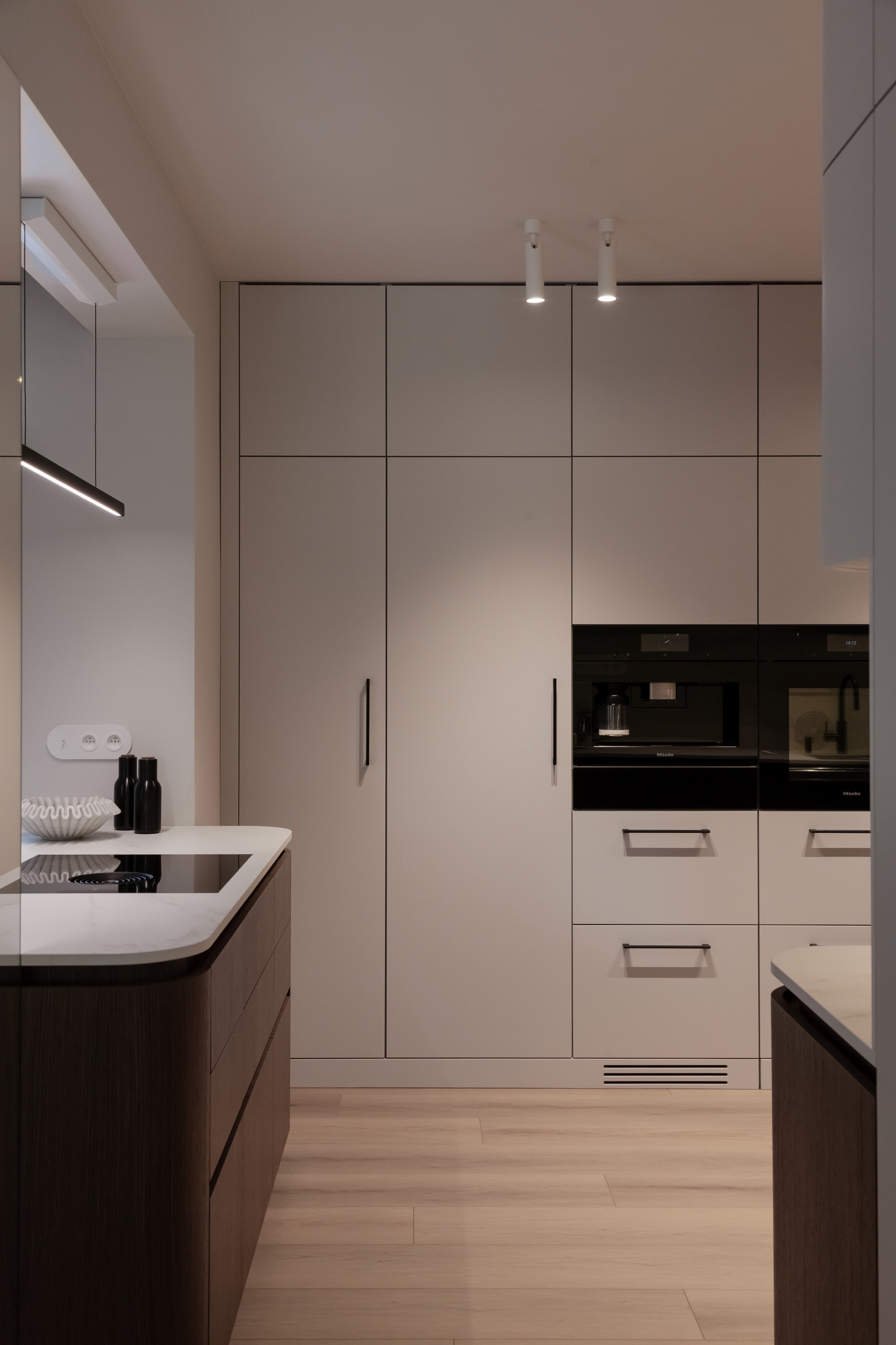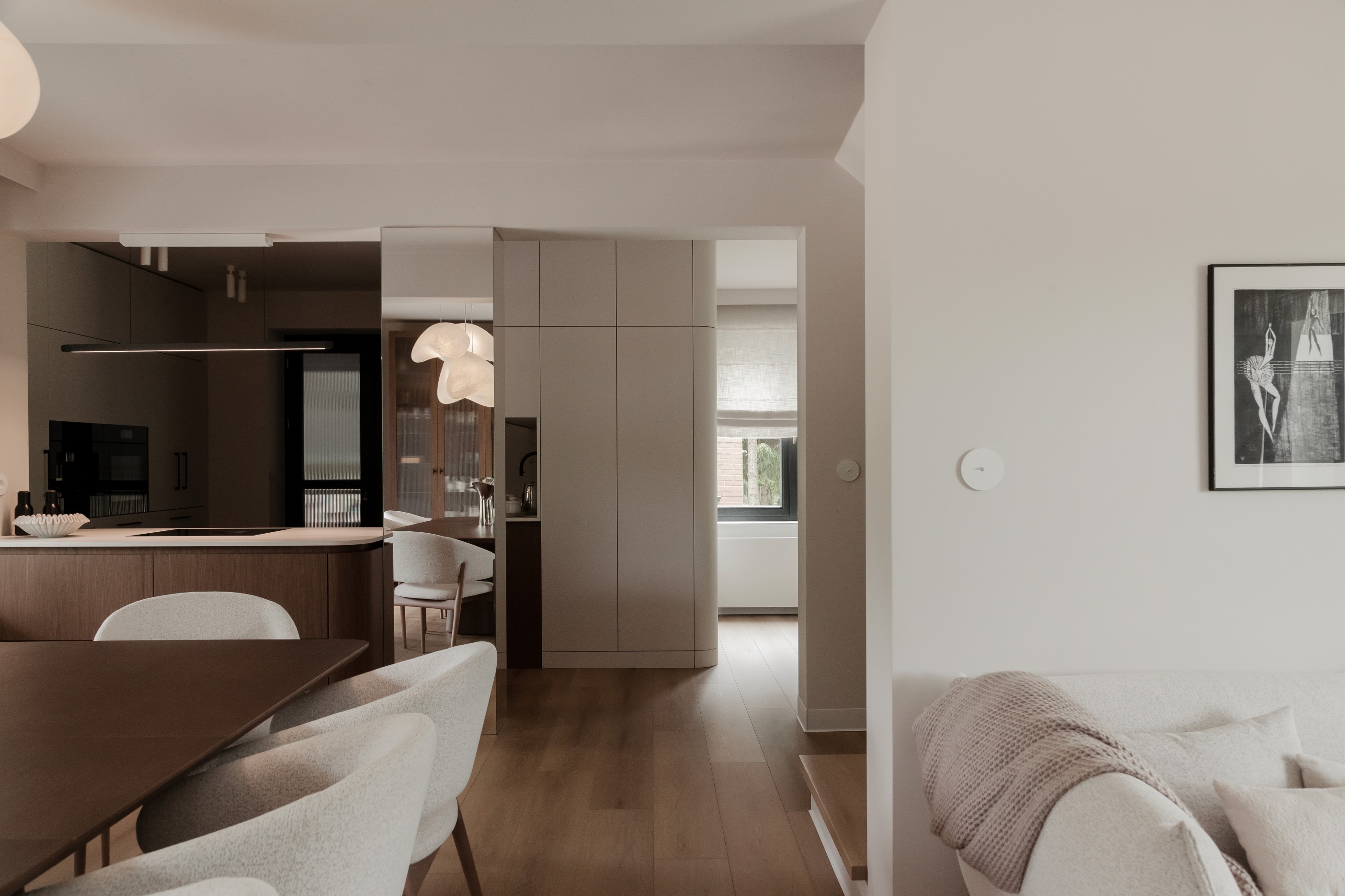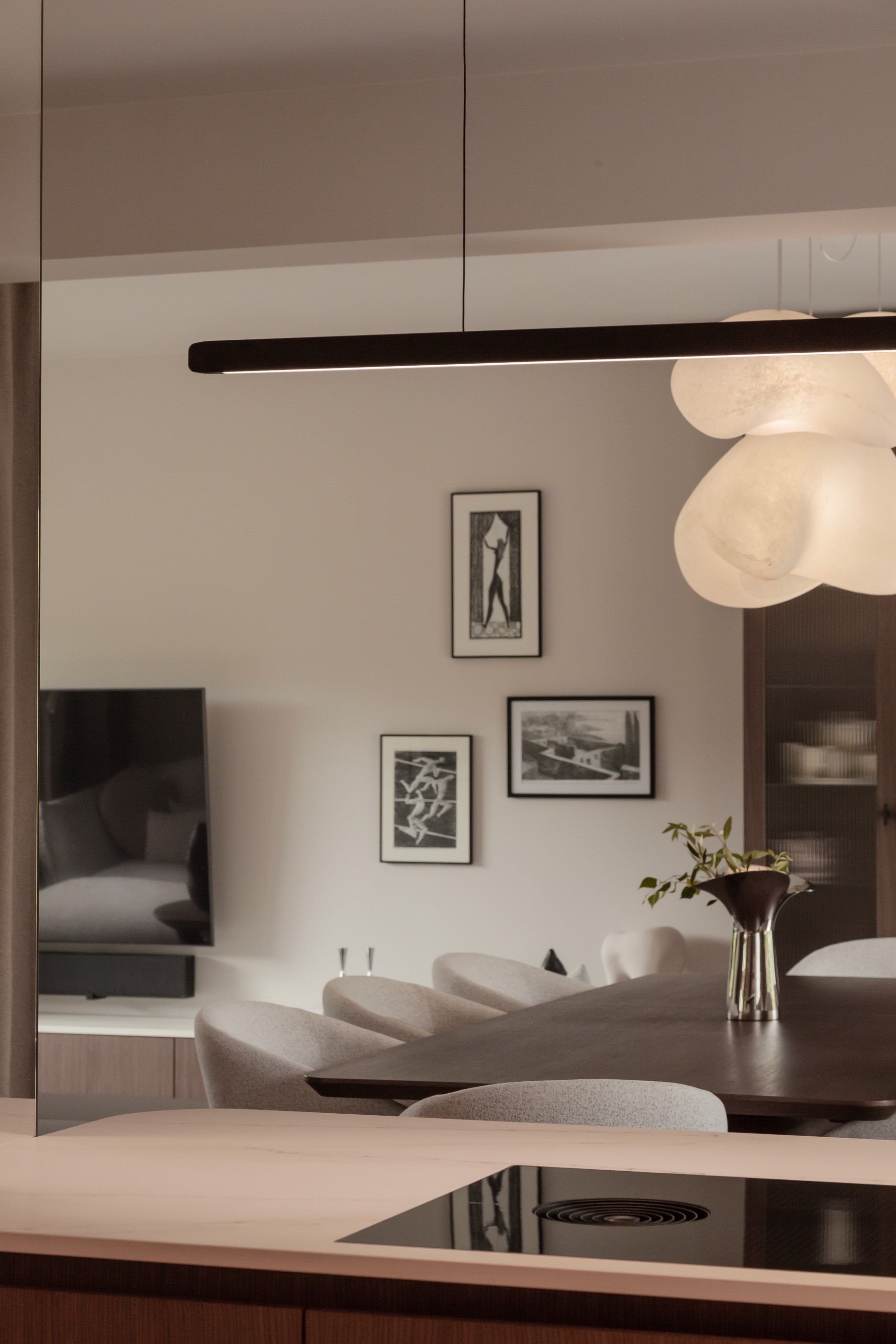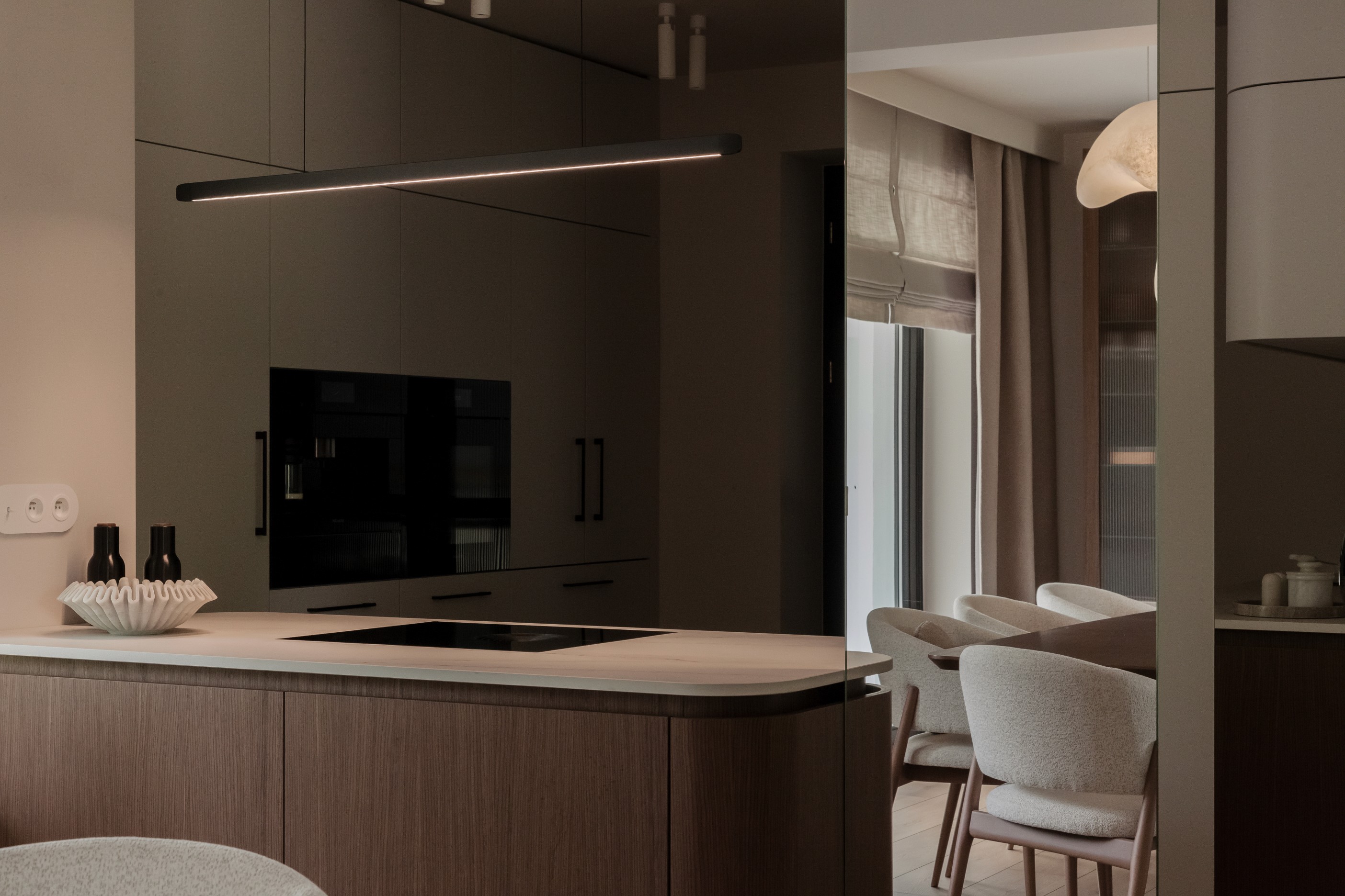 Projekt utrzymany jest w ciepłej, eleganckiej tonacji, z subtelną nutą klasyki. Dominują orzechowy fornir i chłodne beże, otulone miękkim światłem i fakturami tkanin. Zabudowy na wymiar tworzą czyste linie i porządkują przestrzeń, a ich funkcjonalność wspiera codzienne rytuały mieszkańców.