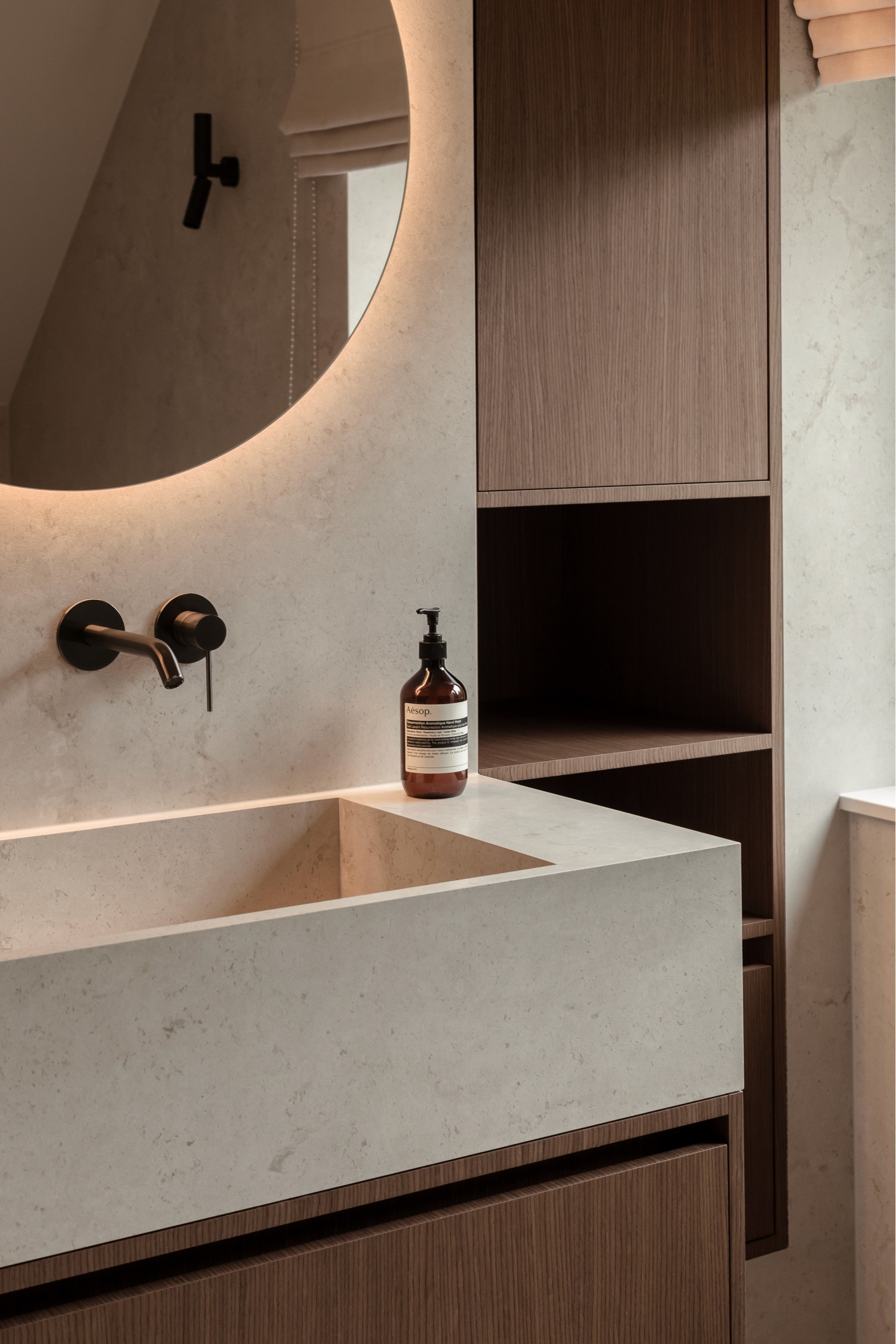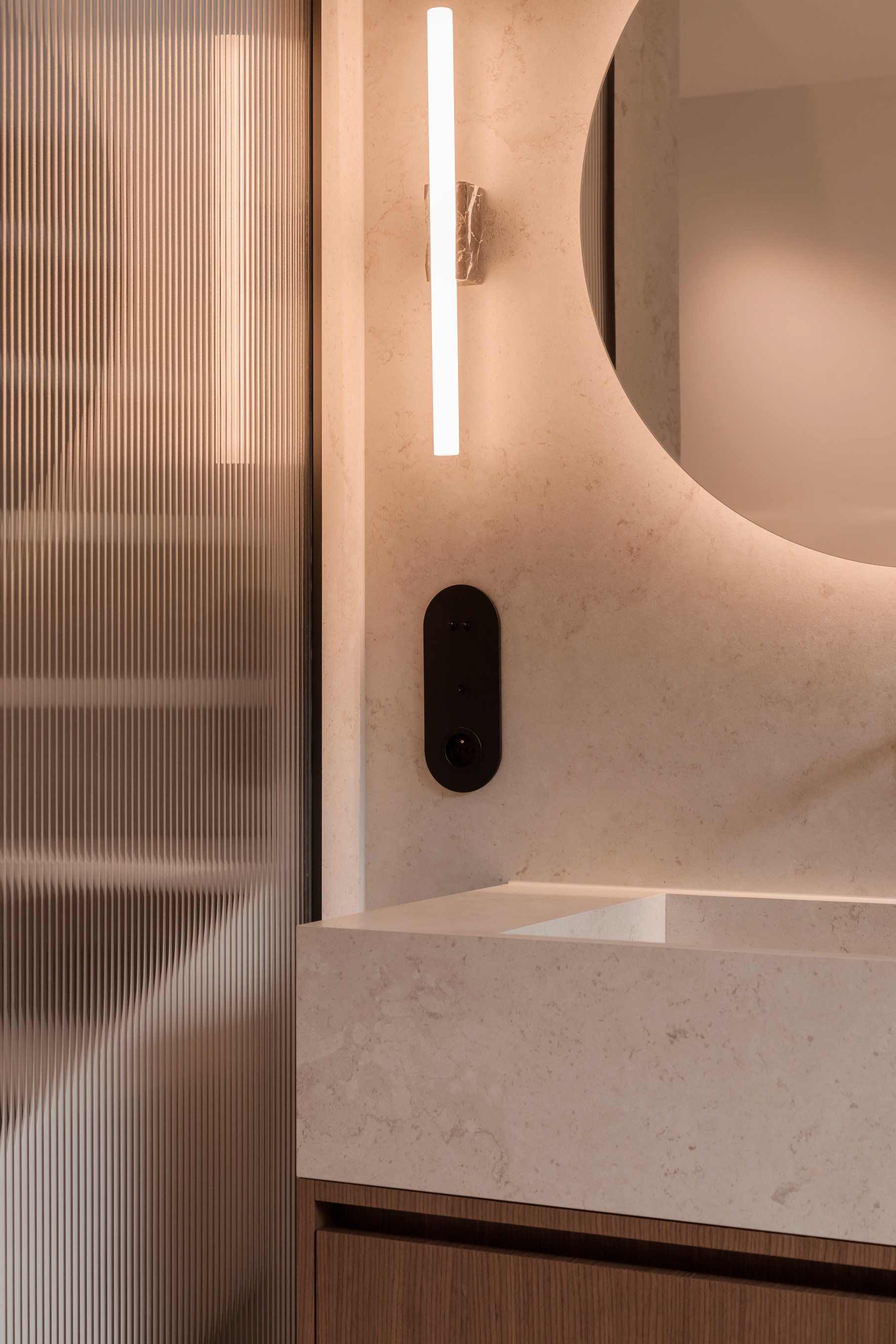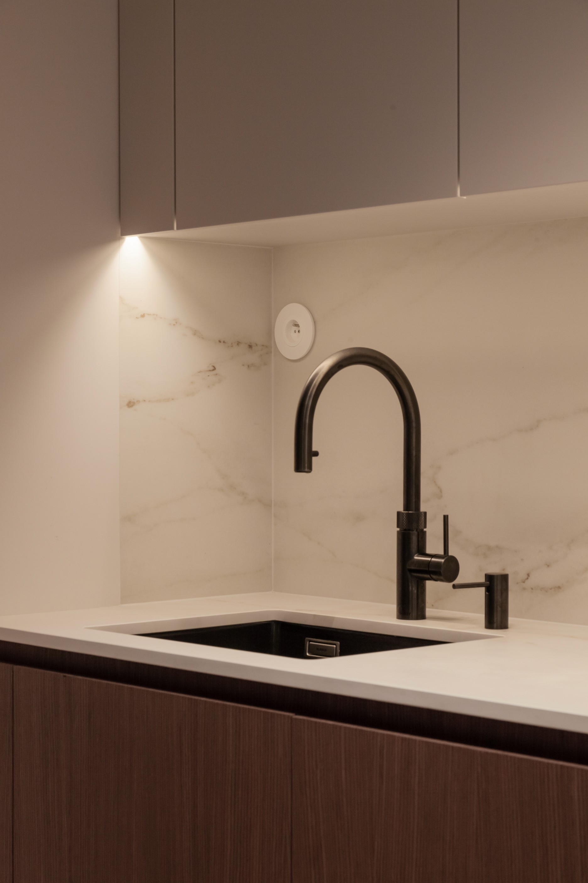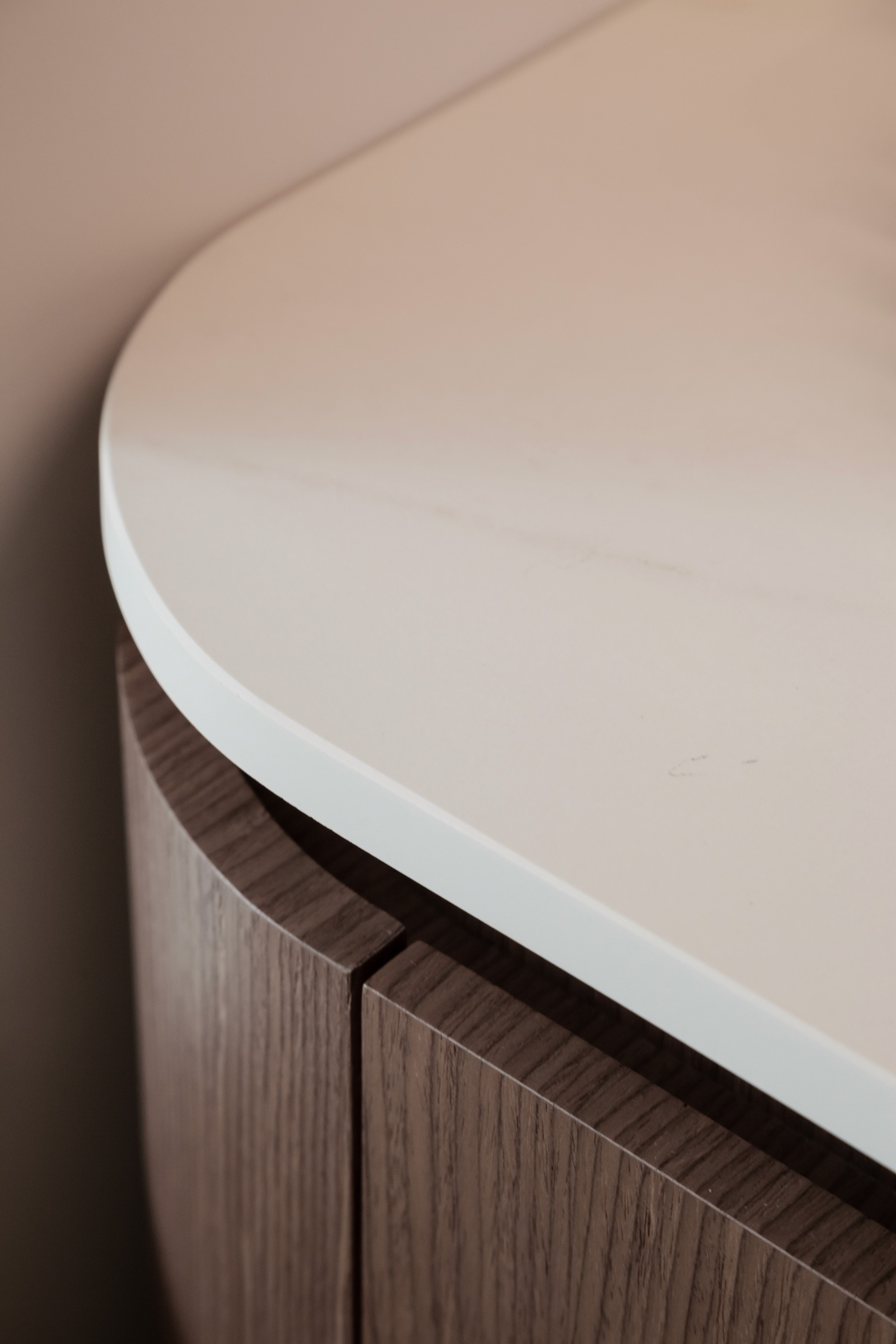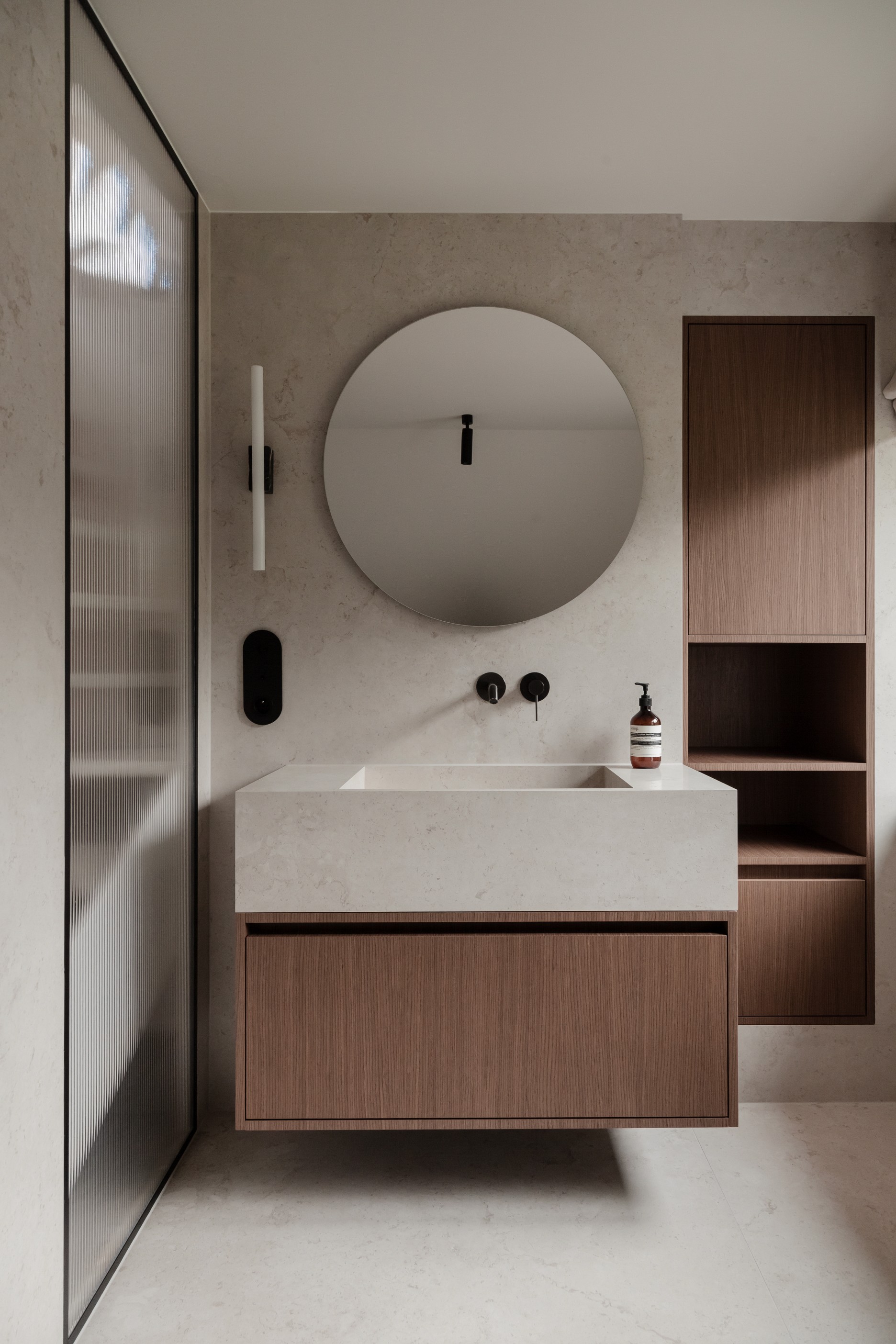 Projekt utrzymany jest w ciepłej, eleganckiej tonacji, z subtelną nutą klasyki. Dominują orzechowy fornir i chłodne beże, otulone miękkim światłem i fakturami tkanin. Zabudowy na wymiar tworzą czyste linie i porządkują przestrzeń, a ich funkcjonalność wspiera codzienne rytuały mieszkańców.